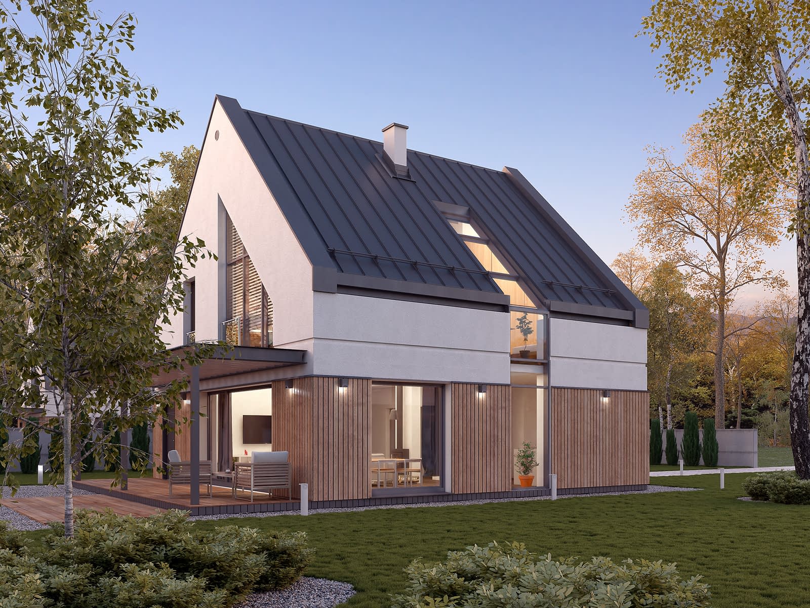 Ściany: 2-warstwowe - bloczek silikatowy + styropian Termo Organika, Stropy: żelbetowe, Dach: blacha na rąbek stojący Ruukki Classic,Rzuty