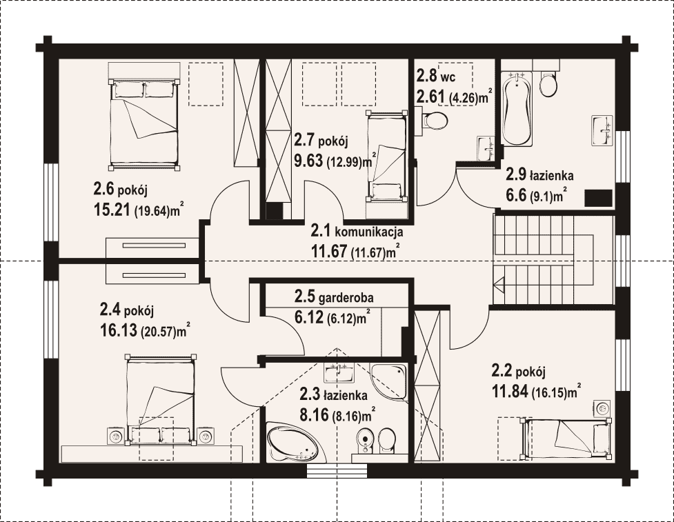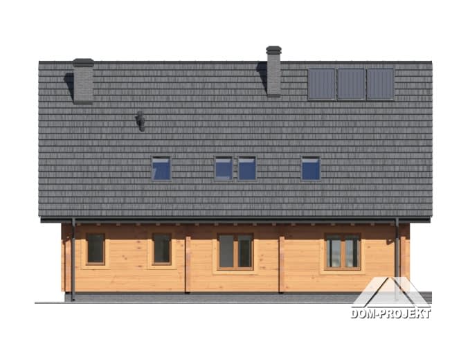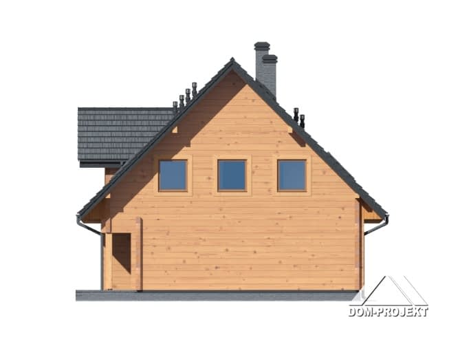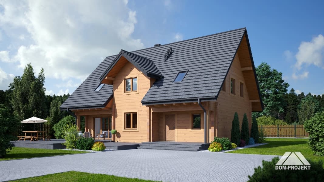 Dom z bali. Duży salon z aneksem kuchennym, kominkiem i wyjściem na taras. Pokój łazienka, komunikacja, wiatrołap i kotłownia. Na poddaszu trzy pokoje, dwie łazienki, wc, garderoba i komunikacja. Zwarta bryła budynku i dach dwuspadowy sprzyjają szybkiej i taniej budowie oraz niskim kosztom eksploatacji.Rzuty