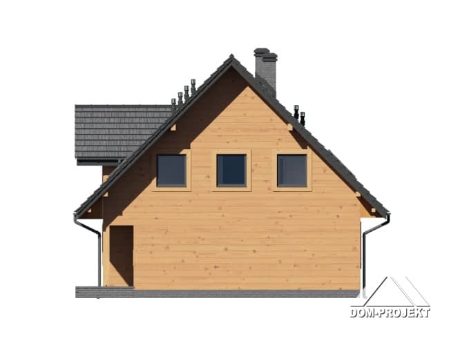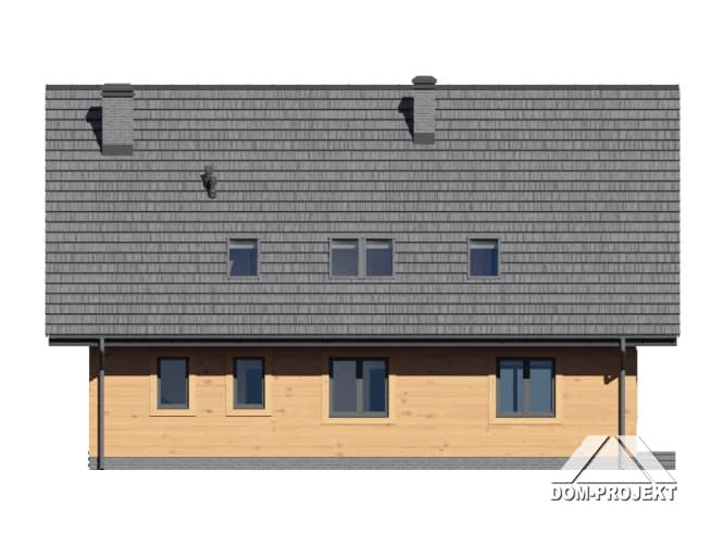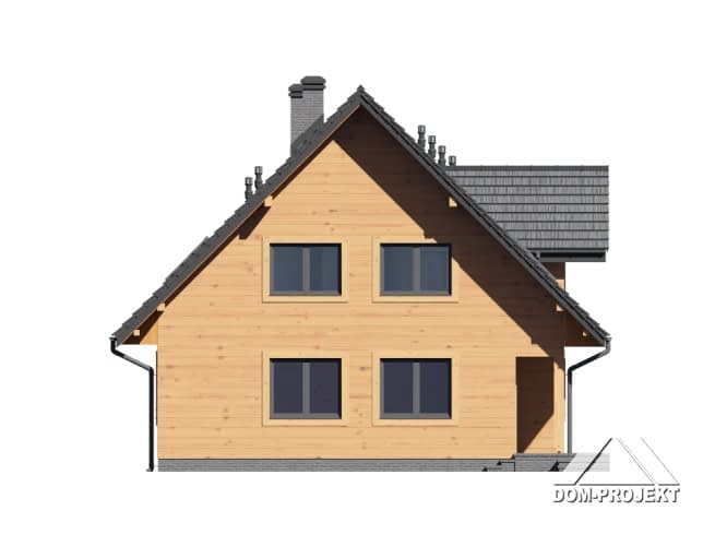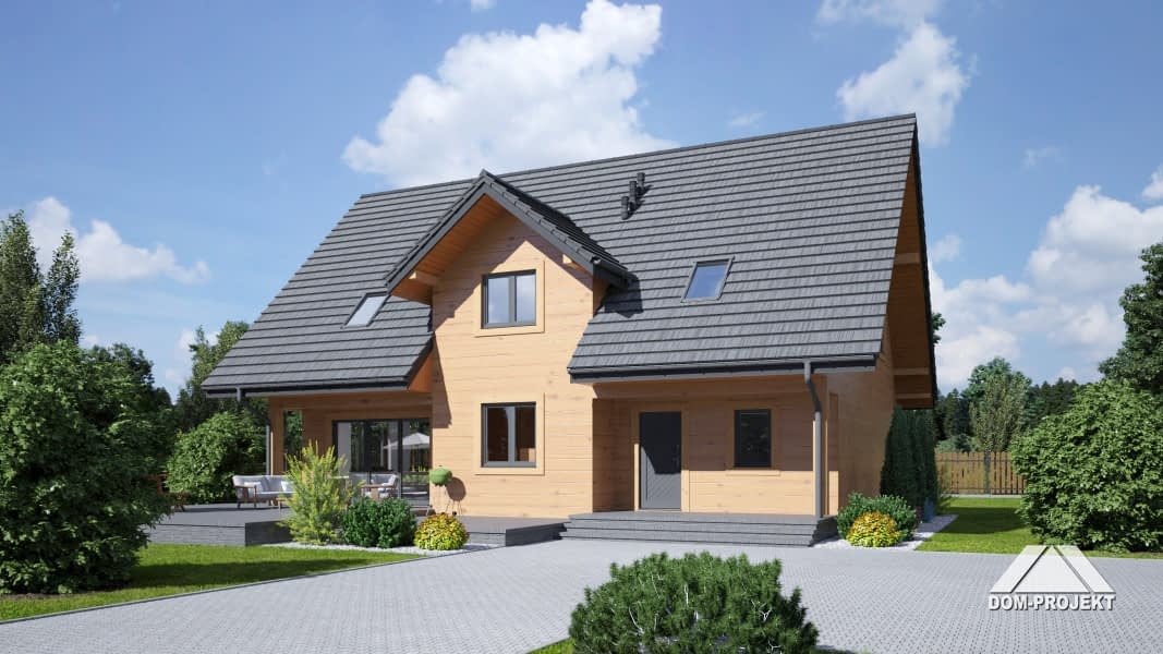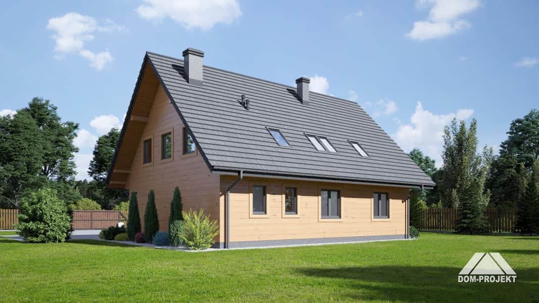 Dom w konstrukcji szkieletu drewnianego. Duży salon z aneksem kuchennym, kominkiem i wyjściem na taras. Pokój. łazienka, komunikacja, wiatrołap i kotłownia. Na poddaszu trzy pokoje, dwie łazienkai, wc, garderoba i komunikacja.Zwarta bryła budynku i dach dwuspadowy sprzyjają szybkiej i taniej budowie i niskim kosztom eksploatacji.Rzuty