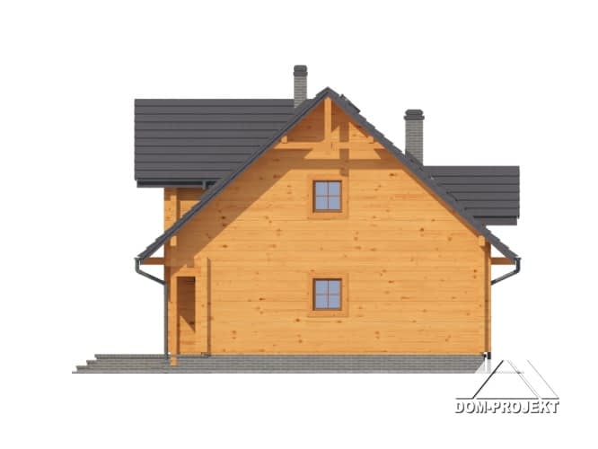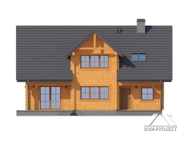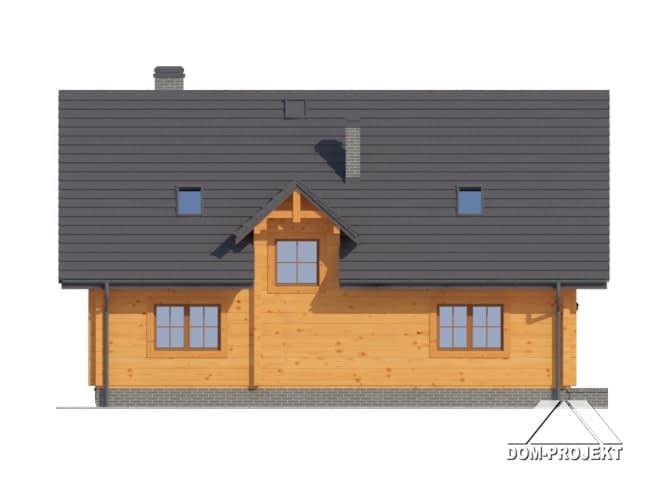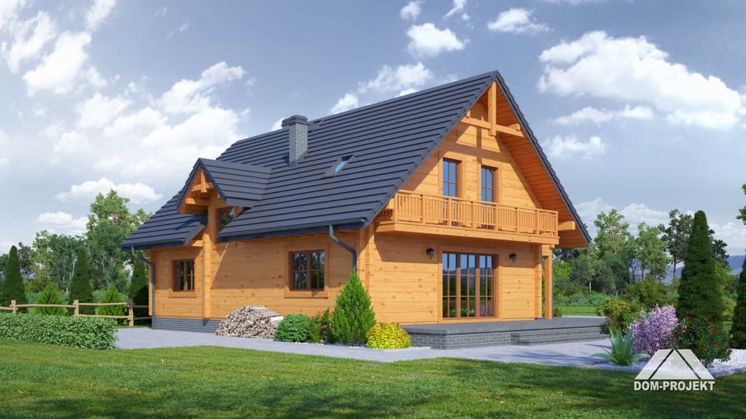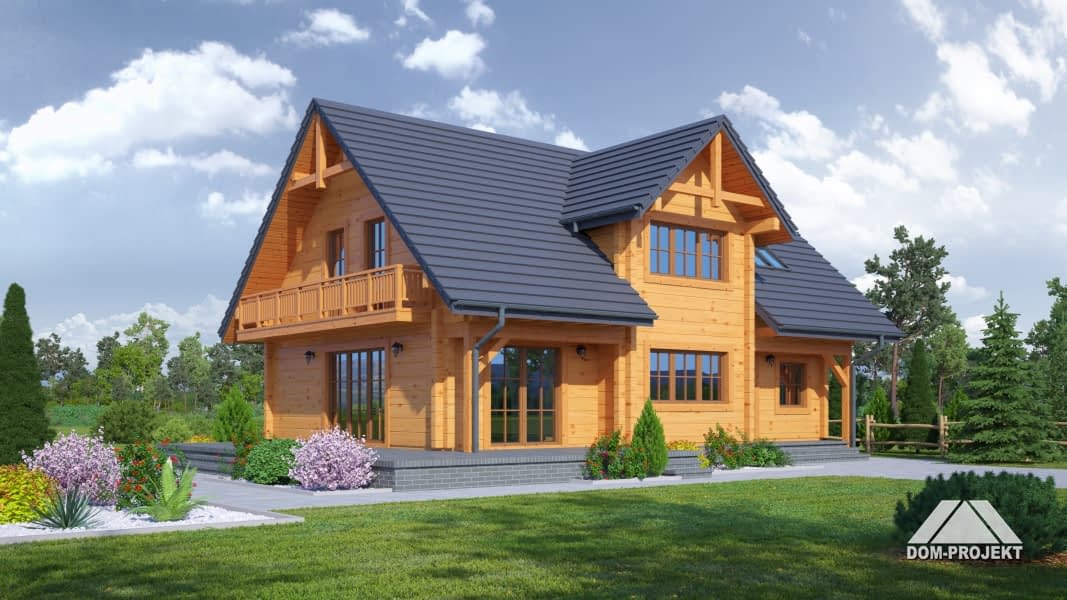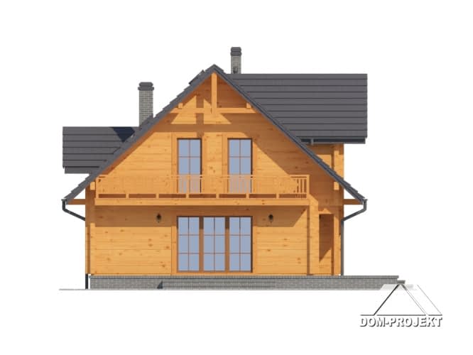 Dom z bali drewnianych. Duży salon z kominkiem, wyjściami na taras i schodami na poddasze, kuchnia, pokój, kotłownia, wiatrołap i korytarz. Na poddaszu trzy pokoje, łazienka, komunikacja i balkon.Zwarta bryła budynki i dach dwuspadowy sprzyjają łatwej i szybkiej budowie i niskim kosztom eksploatacji.Rzuty