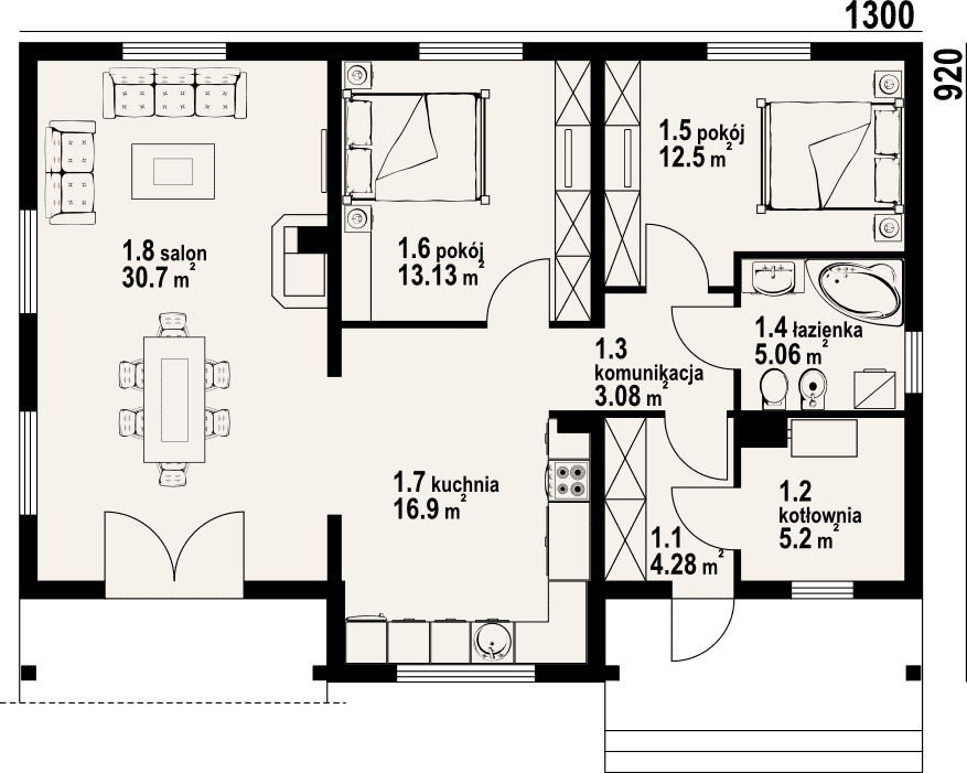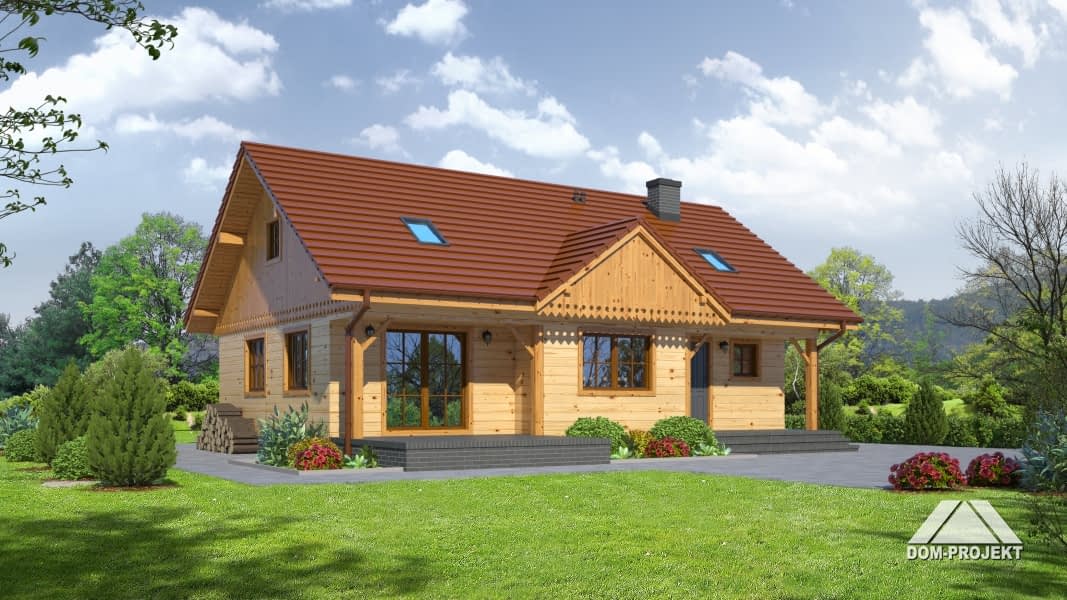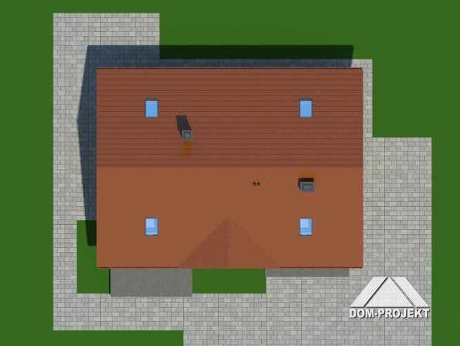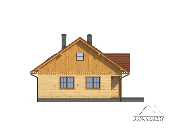 Nieduży dom parterowy w technologii szkieletowej. Idealny na działkę z wejściem od południa. Program użytkowy domu stanowią: duży salon z kominkiem i wyjściem na taras, otwarta kuchnia, dwa pokoje, łazienka, komunikacja, wiatrołap oraz kotłownia.Rzuty