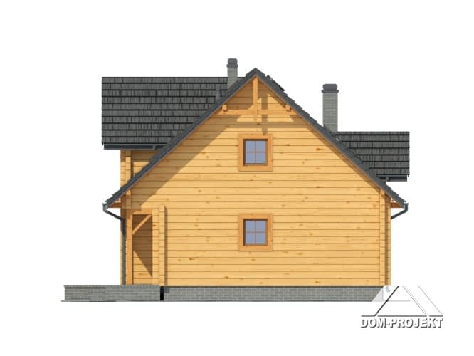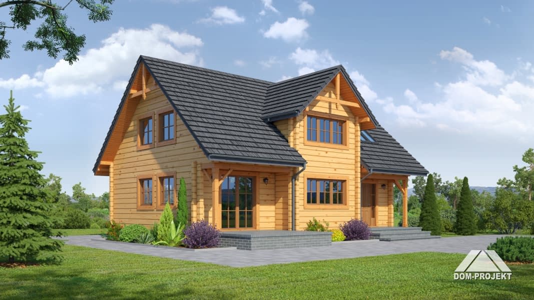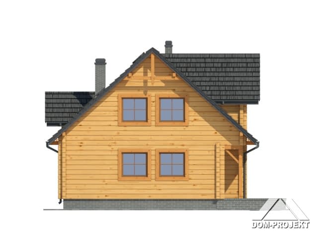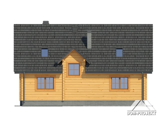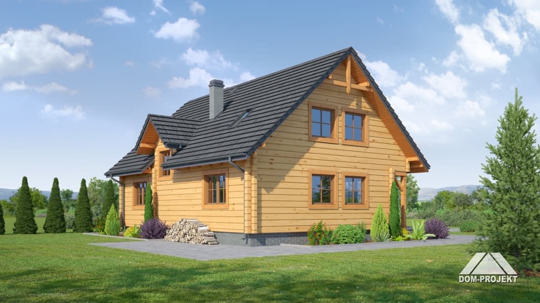 Dom z poddaszem użytkowym. Wejście do budynku poprzez podcień, wiatrołap z miejscem na szafę. Duży salon z kominkiem i schodami na poddasze. Taras ziemny częściowo zadaszony. Wygodna kuchnia, pokój i łazienka to pozostałe pomieszczenia na parterze. Na poddaszu trzy pokoje różnego metrażu, łazienka, garderoba.Rzuty