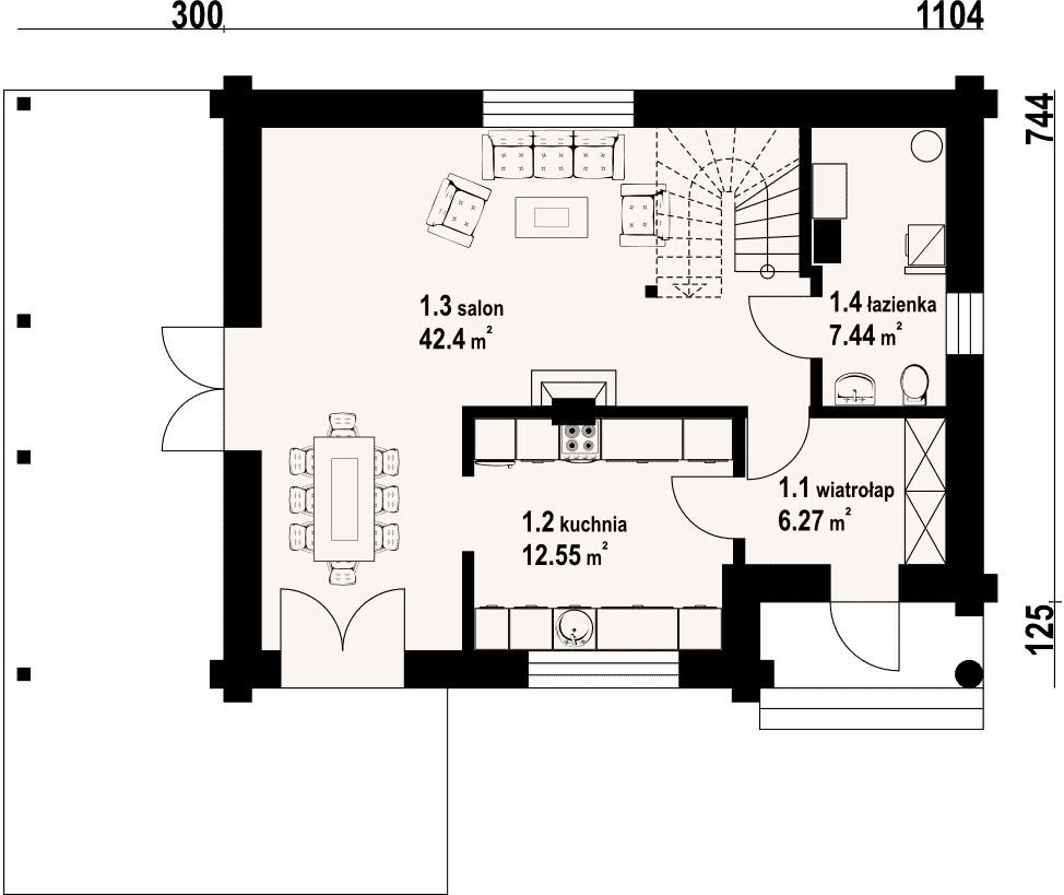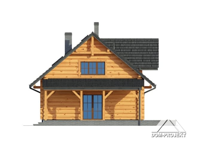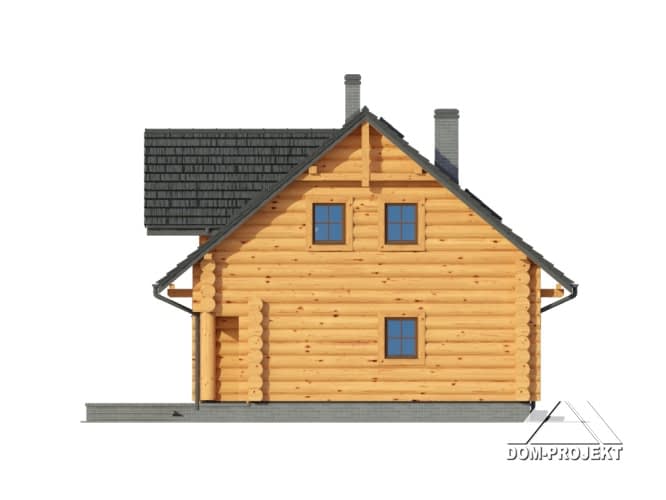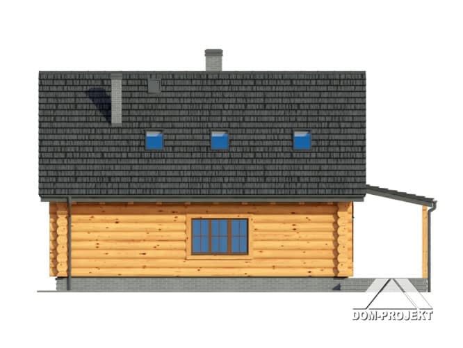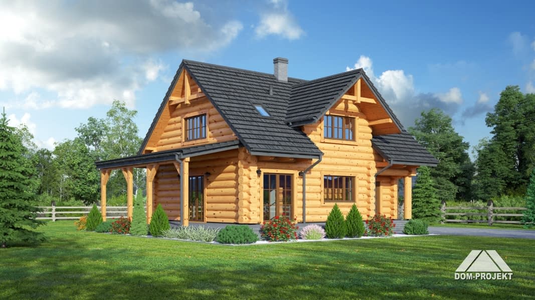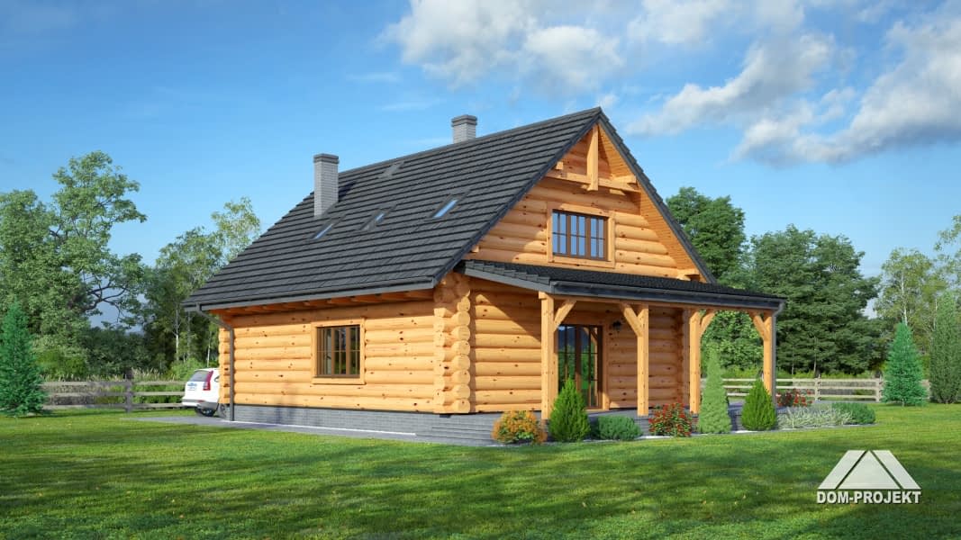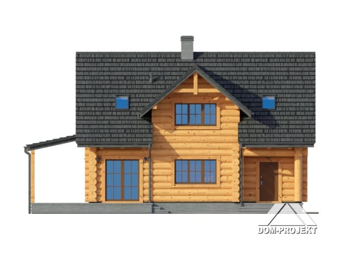 Dom z bali drewnianych. Duży salon z jadalnią, wypoczynkiem, kominkiem, schodami na poddasze, wyjściem na zadaszony taras i przejściem do kuchni. Duża kuchnia, wiatrołap, łazienka. Na poddaszu trzy pokoje, dwie łazienki, garderoba i komunikacja. Zwarta bryła budynku i dach dwuspadowy sprzyjają szybkiej i taniej budowie i niskim kosztom eksploatacji.Rzuty