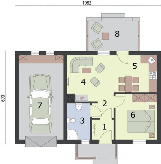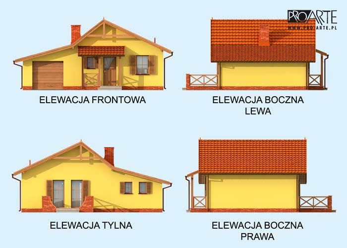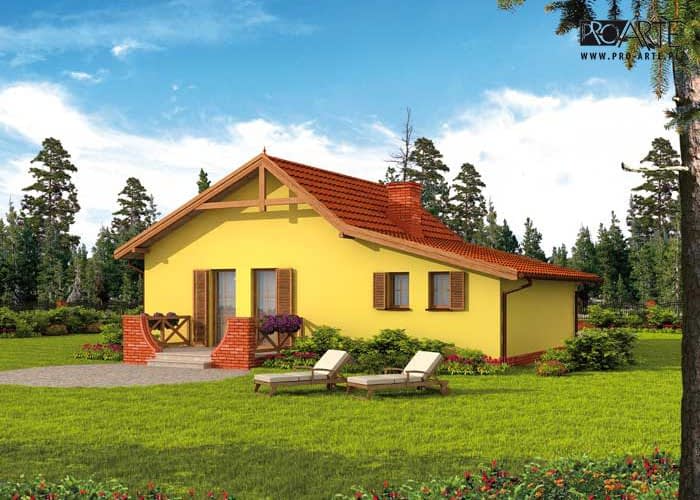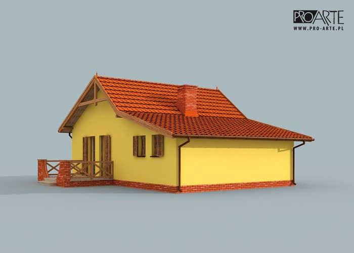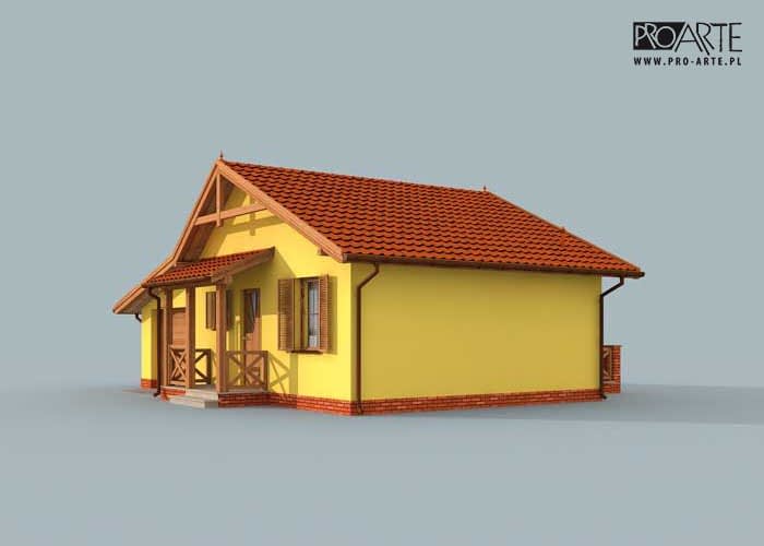 Ten dom letniskowy to idealne rozwiązanie dla wszystkich wiedzących, czego chcą od życia. Praktyczne rozwiązania takie jak dwuspadowy dach, który od zachodu płynnie przechodzi dach garażu zachęca potencjalnych inwestorów. Tym samym w ramach jednej bryły budynku mamy dom i garaż. Wejście od południa, które wyróżnia zadaszona weranda świetnie koresponduje z drewnianymi jętkami dachu. Podobnie dachówki i cokolik odpowiadają sobie kolorami, tworząc przemyślaną, zrównoważoną kompozycję. Gustowne elewacje zyskują potwierdzenie w przytulnych oraz komfortowych wnętrzach. Weranda wiedzie do wiatrołapu, z którego przechodzi się do komunikacji. Po lewej stronie znajduje się łazienka, natomiast po prawej stronie komunikacji jest dość obszerna sypialnia. Od komunikacji na wprost usytuowany jest pokój dzienny z aneksem kuchennym, w którym znajduje się kominek. Jest to miejsce, które z pewnością w zimowe wieczory będzie skupiać życie wypoczywających w domu ludzi. Letnie dni będzie można spędzać w biesiadnej atmosferze, przy grillu na tarasie.