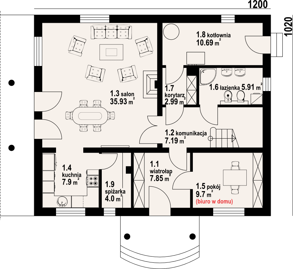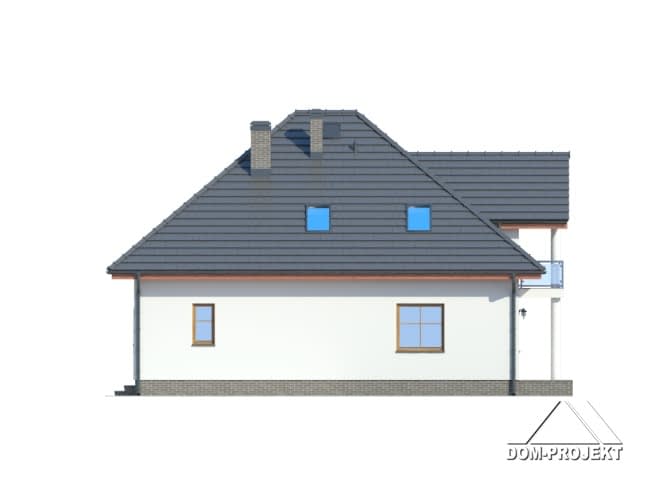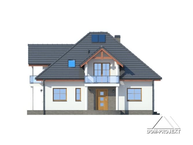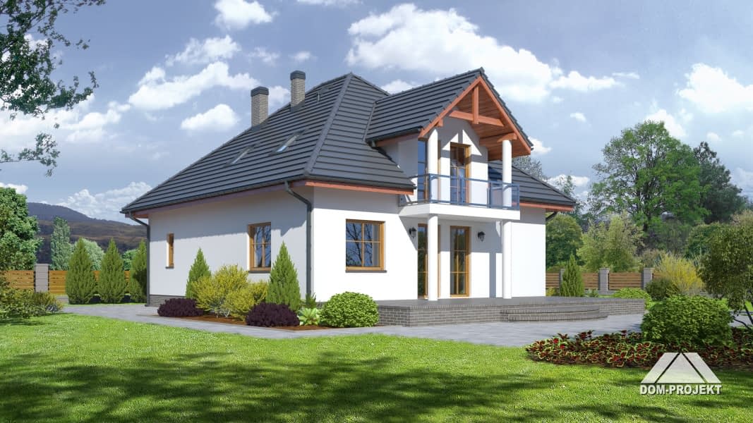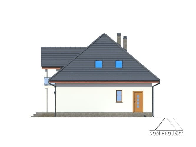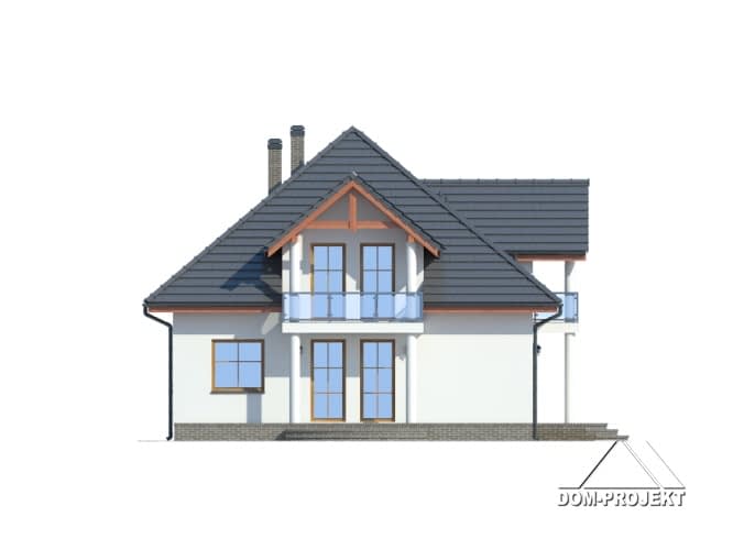 Funkcjonalny dom z poddaszem. Na parterze część dzienna, którą stanowi przestronny salon, ponadto częściowo zamknięta kuchnia ze spiżarką. W salonie kominek. Z wiatrołapu dostępny pokój-biuro, w którym można urządzić biuro w domu. Program parteru uzupełniają łazienka i duża kotłownia. Na poddaszu cztery sypialnie, łazienka i garderoba.Rzuty