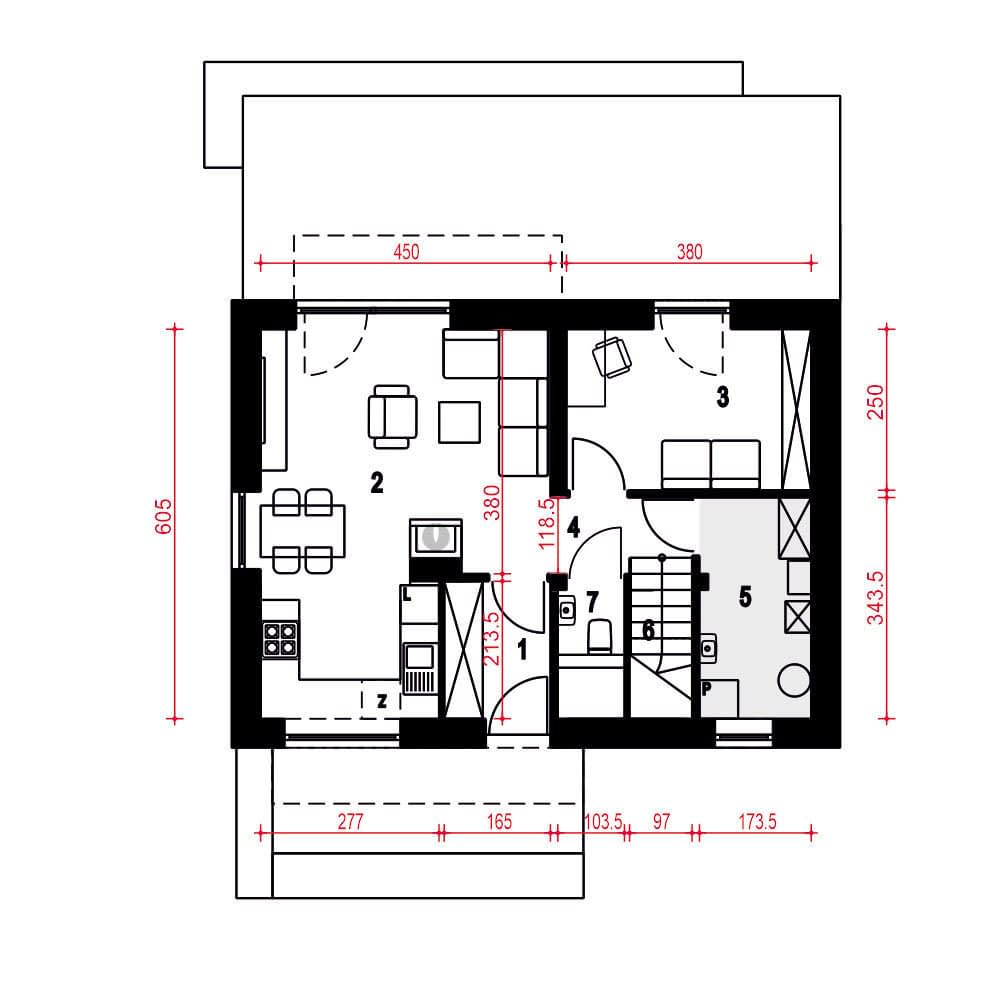 Borówka to mały domek o pow. zabudowy do 70m2. Projekt zawiera salon z kuchnia oraz dodatkowy pokój na parterze a na poddaszu 3 pokoje i łazienkę. Urokliwa Borówka może z powodzeniem stać się wygodnym lokum dla dla 4 osobowej rodziny. Projekt cechuje proporcjonalna bryła oraz eleganckie w wykończeniu elewacje.