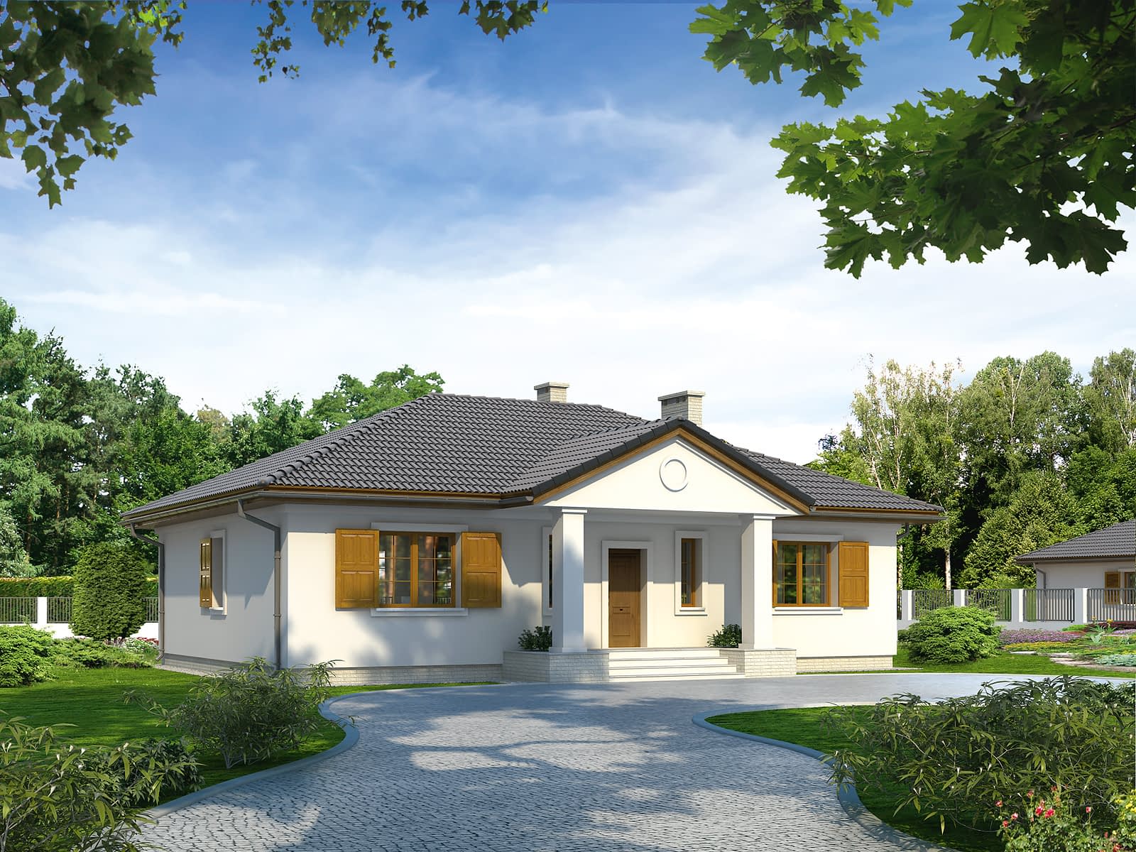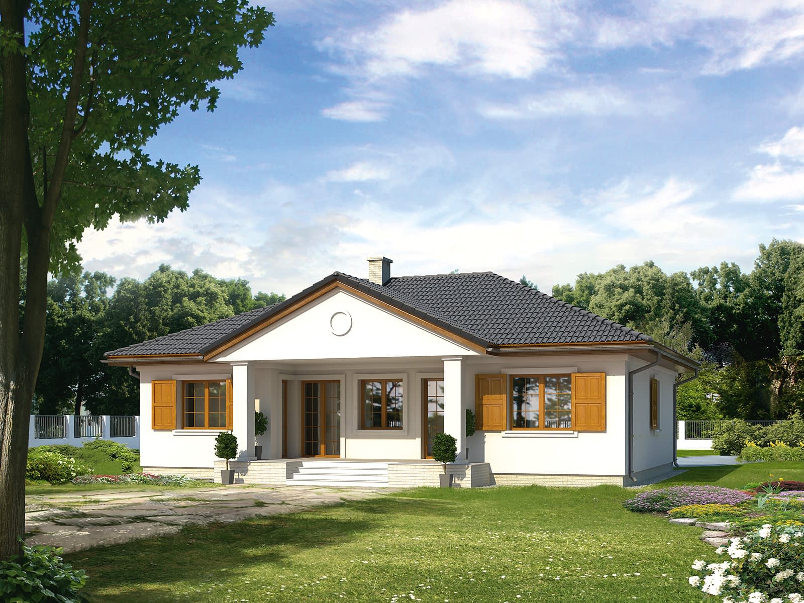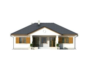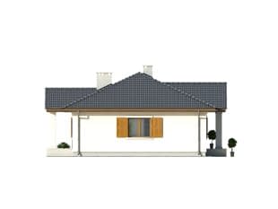 Dom jednorodzinny, wolno stojący, parterowy, idealny dla 4-osobowej rodziny. Układ pomieszczeń posiada podział na część dzienną i nocną. Zaprojektowano przestronny, otwarty salon z kuchnią i jadalnią. W części nocnej przewidziano trzy sypialnie, z których dwie posiadają wyjście na taras.Konstrukcja