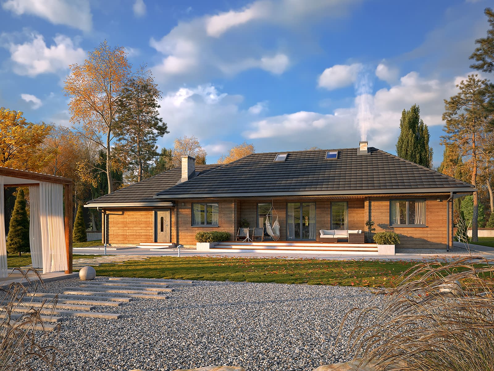 Borówka 7 to dom parterowy rozplanowany na symetrycznym rzucie, do którego dodano garaż na dwa samochody. Konstrukcja została wykonana z drewna, a elewacja z bali. Dach wielospadowy został przykryty ciemną dachówką ceramiczną. Na parterze znajdują się: wiatrołap, garderoba, wc, łazienka, 3 sypialnie, pokój dzienny z jadalnią, kuchnia, garaż z kotłownią.Konstrukcja