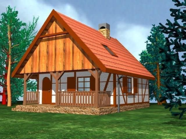 Wymiary budynku 6.00 x 6,00 + taras 2,00m. Ten niedrogi o konstrukcji drewnianej szkieletowej (tak zwany mur pruski) dom letniskowy zapewni Państwu wszystkie wygody niezbędne podczs letniego wypoczynku. Budynek całoroczny. Na powierzchni 37 m2 znajdują się: pokój z kominkiem, połączona z pokojem dziennym kuchnia, sypialnia i łazienka. Po drewnianych schodkach drabiniastych wchodzi się na antresolę, gdzie można urządzić dodatkowe miejsca do spania. Prostota konstrukcji, optymalne wymiary i standadowe nezbędne wygody zapewnią Państwu przyjemny wypoczynek, jeśli zdecydują się Państwo na budowę tego domu. Ogrzewanie elektryczne i centralnie ustawiony kominek ogrzeje doskonalnie całość.
