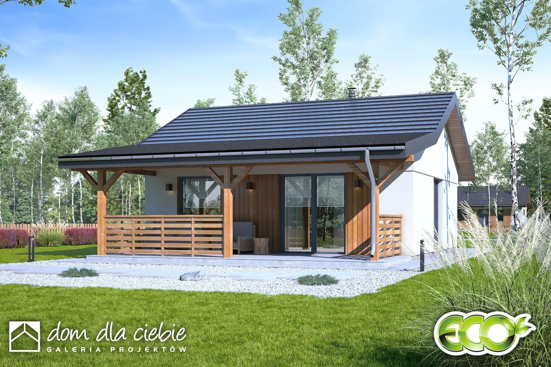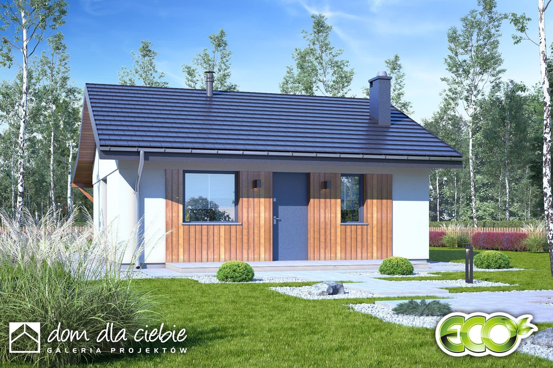 Projekt domu Bratek to mały domek parterowy dla 2-3 osobowej rodziny. Prosta konstrukcja i forma budynku w tym dwuspadowy dach sprawiają, że jest to dom bardzo ekonomiczny w budowie i w użytkowaniu. Projekt domu Bratek można z powodzeniem wykorzystać jako dom rekreacyjny do użytku własnego lub inwestycyjnie. Na funkcję domu składa się wiatrołap z wnękową szafą, kuchnia, salon z jadalnią, sypialnia, wygodna łazienka oraz kotłownia, na paliwo stałe. Od strony ogrodu projekt posiada wygodny zadaszony taras odpowiadający szerokości domu. W kotłowni z powodzeniem można zastosować również piec na paliwo gazowe, w tym celu możemy opracować stosowny aneks.Projekt domu Bratek to ekonomiczna propozycja domu energooszczędnego o powierzchni do 50m2.