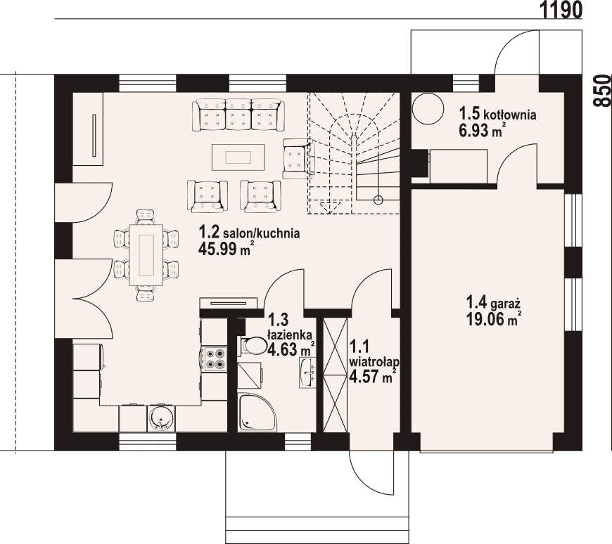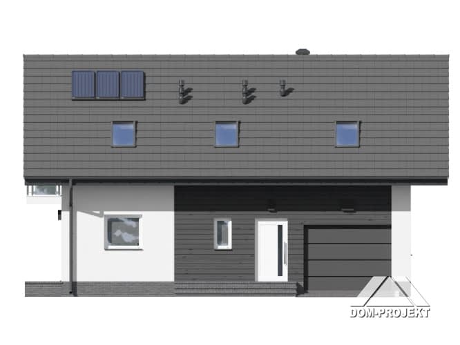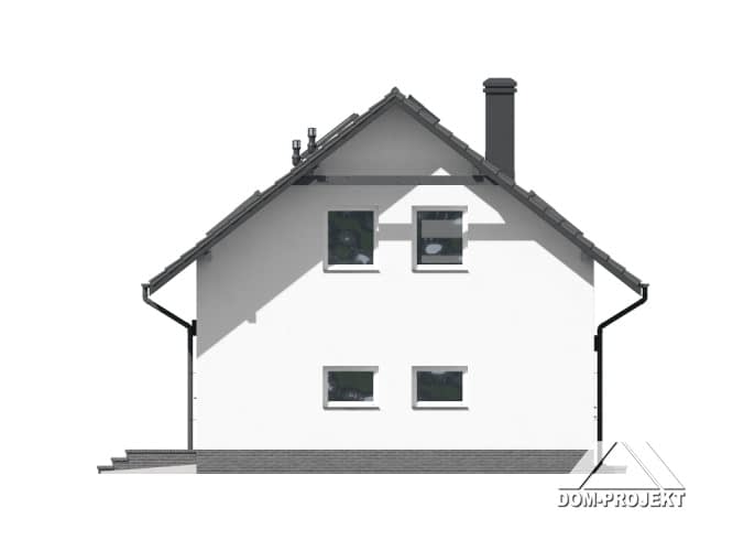 Dom z poddaszem. Duży salon z aneksem kuchennym, schodami na poddasze i wyjściami na taras. Łazienka, wiatrołap, garaż i kotłownia. Na poddaszu cztery pokoje, łazienka, wc, komunikacja i balkon. Zwarta bryła budynku i dach dwuspadowy sprzyjają szybkiej i taniej budowie i niskim kosztom eksploatacji.Rzuty