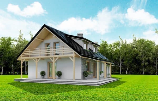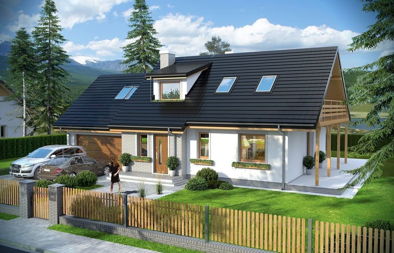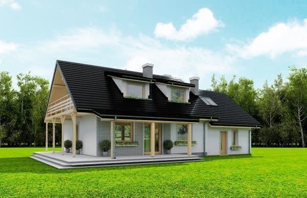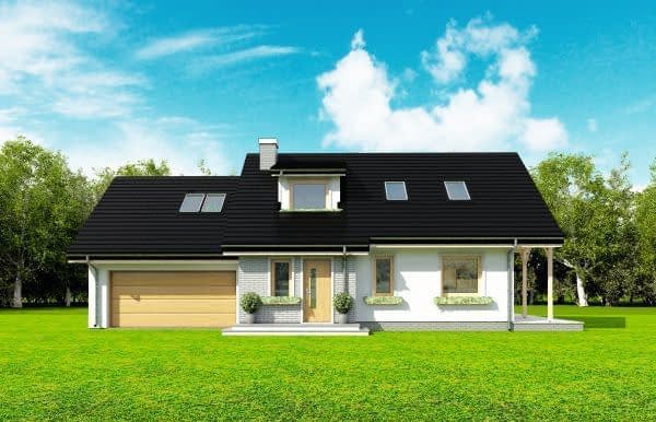 Wariant projektu ze zwężonym garażem. Taras drewniany. Zmiana układu okien oraz wyglądu elewacji.