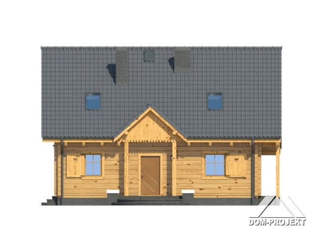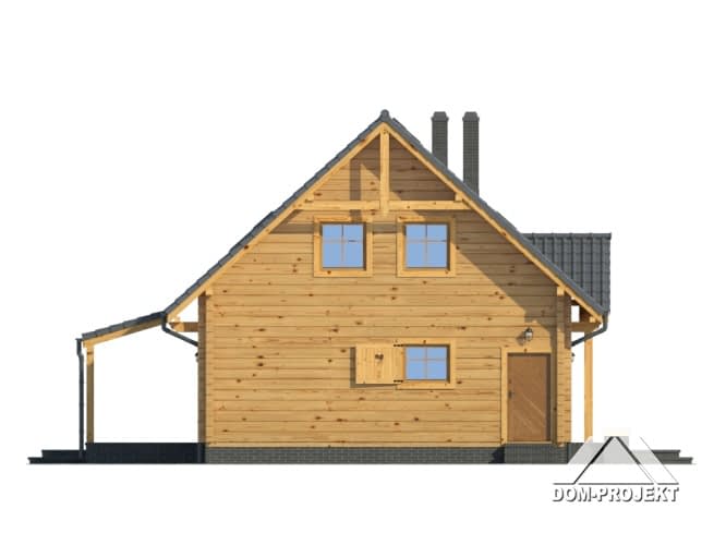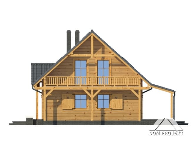 Dom z bali drewnianych. Duży salon z aneksem kuchennym, kominkiem, schodami na poddasze i wyjściem na taras. Pokój, łazienka, wiatrołap i kotłownia. Na poddaszu cztery pokoje, łazienka i komunikacja. Balkon. Zwarta bryła budynku i dach dwuspadowy sprzyjają szybkiej i taniej budowie i niskim kosztom eksploatacji.Rzuty