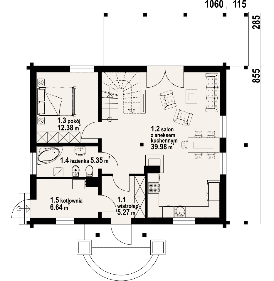 - 1.2 - salon z aneksem kuchennym39.98 m²