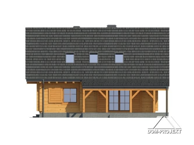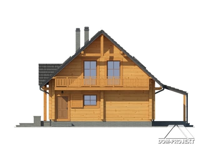 Dom z bali drewnianych. Duży salon z aneksem kuchennym, kominkiem wyjściem na taras i schodami na poddasze. Pokój, łazienka, kotłownia i wiatrołap. Na poddaszu cztery pokoje, łazienka, komunikacja i dwa balkony. Prosta bryła budynku i dach dwuspadowy sprzyjają szybkiej i taniej budowie i niskim kosztom eksploatacji.Rzuty