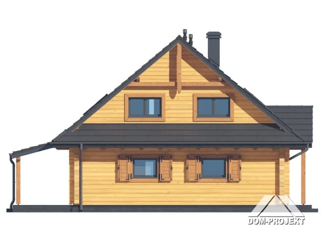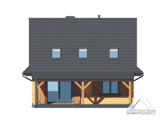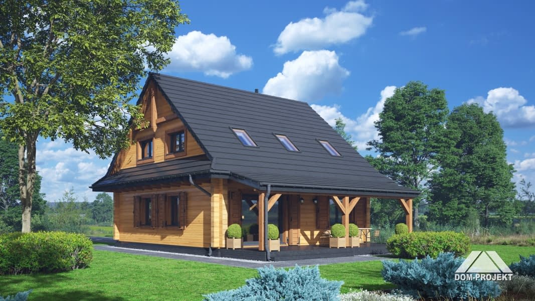 Dom z bali drewnianych. Na parterze salon z kuchnią, kominkiem, wyjściem na duży, zadaszony taras oraz schodami na poddasze. Pokój, łazienka, pomieszczenie gospodarcze, wiatrołap. Na poddaszu trzy pokoje, łazienka, komunikacja. Zwarta bryła budynku oraz dach dwuspadowy sprzyjają szybkiej i taniej budowie oraz niskim kosztom eksploatacjiRzuty
