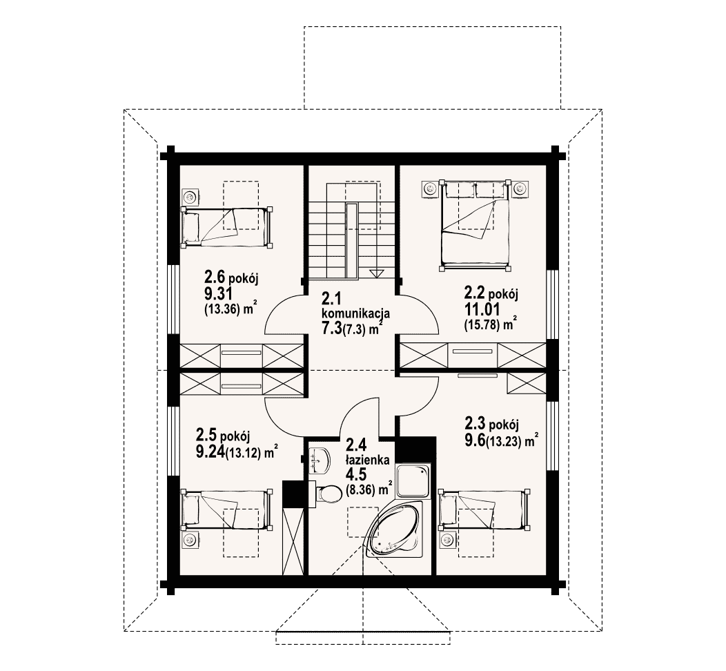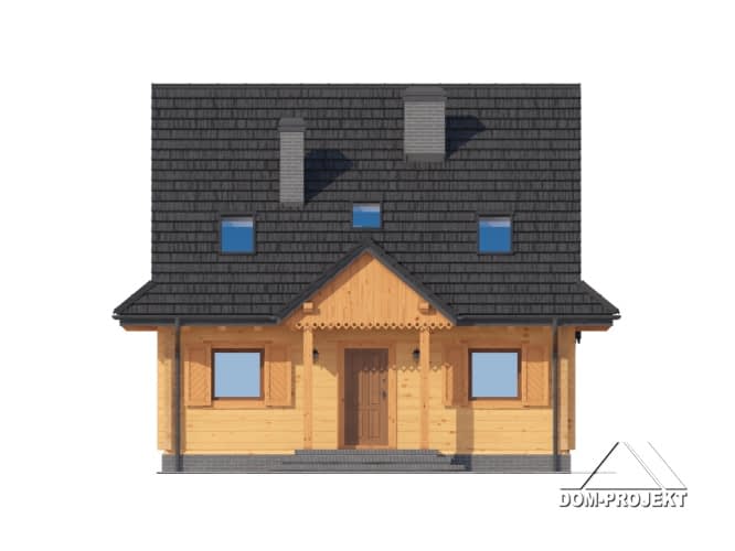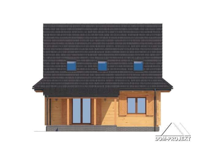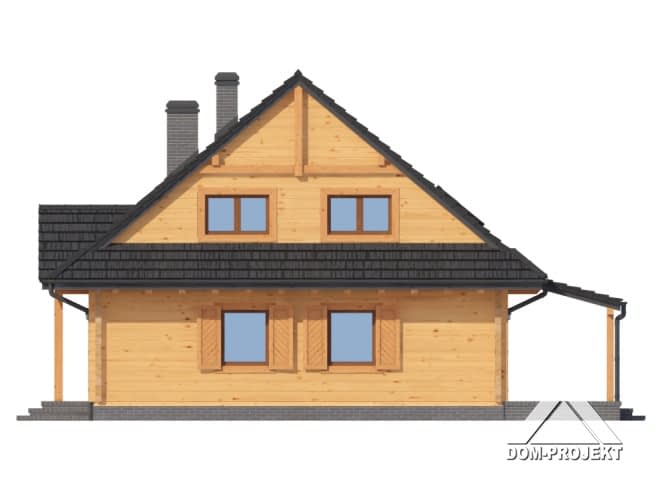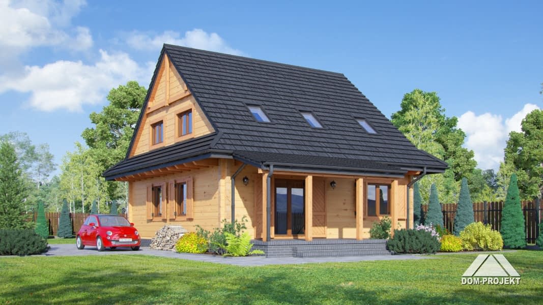 Dom z bali drewnianych. Duży salon z aneksem kuchennym, kominkiem, schodami na poddasze i wyjściem na zadaszony taras. Pokój, łazienka, kotłownia, wiatrołap. Na poddaszu cztery pokoje, łazienka i komunikacja. Zwarta bryła budynku i dach dwuspadowy sprzyjają szybkiej i taniej budowie i niskim kosztom eksploatacji.Rzuty