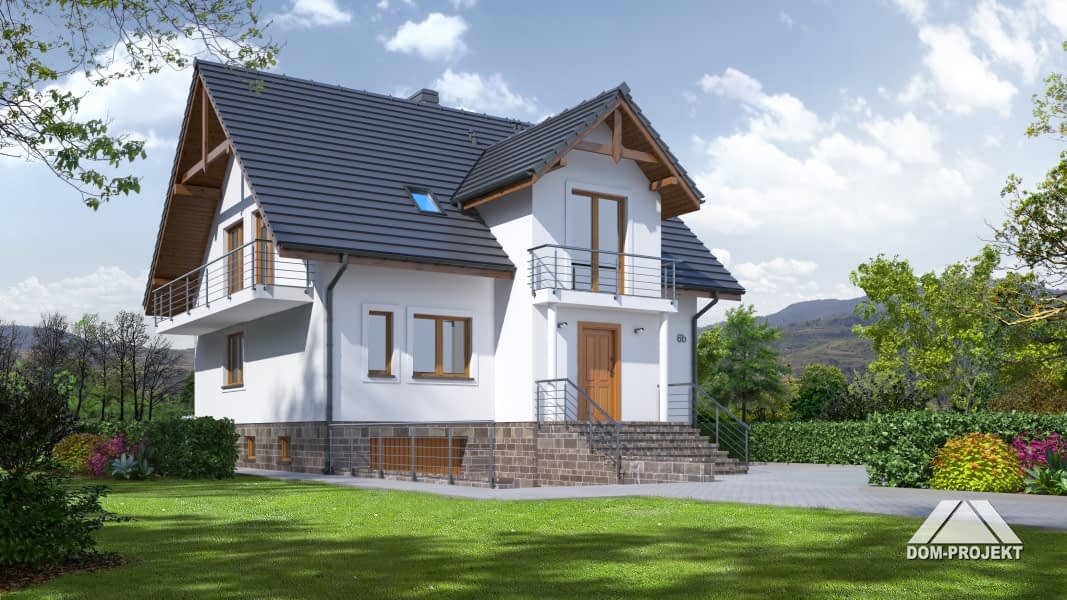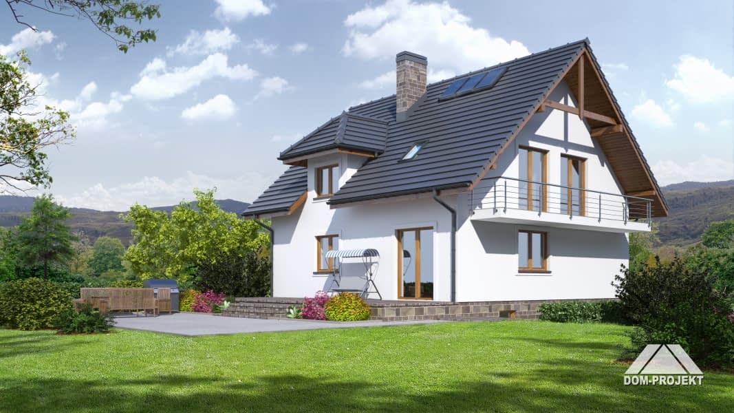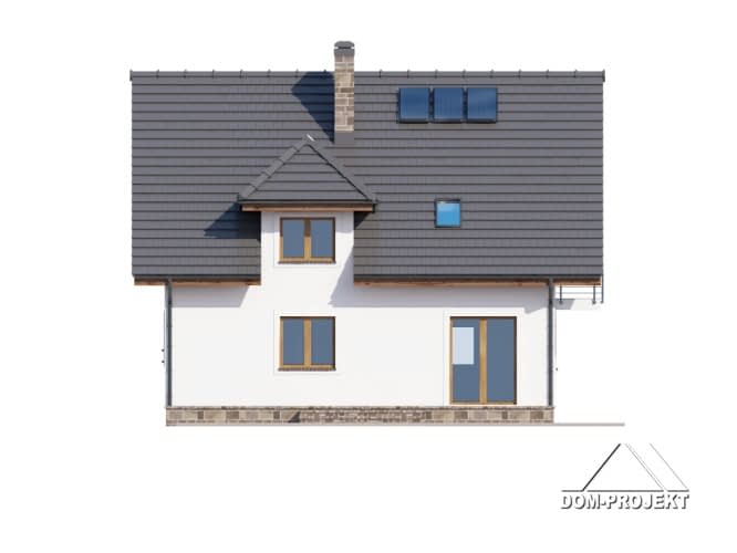 Dom z poddaszem użytkowym i całkowitym podpiwniczeniem. W piwnicach garaż i zaplecze gospodarcze. Na parterze salon z kominkiem, pokój, wydzielona kuchnia ze spiżarką. Ponadto łazienka i pom. gospodarcze. Na poddaszu cztery sypialnie, w tym trzy z wyjściem na balkon, oraz łazienka.Rzuty