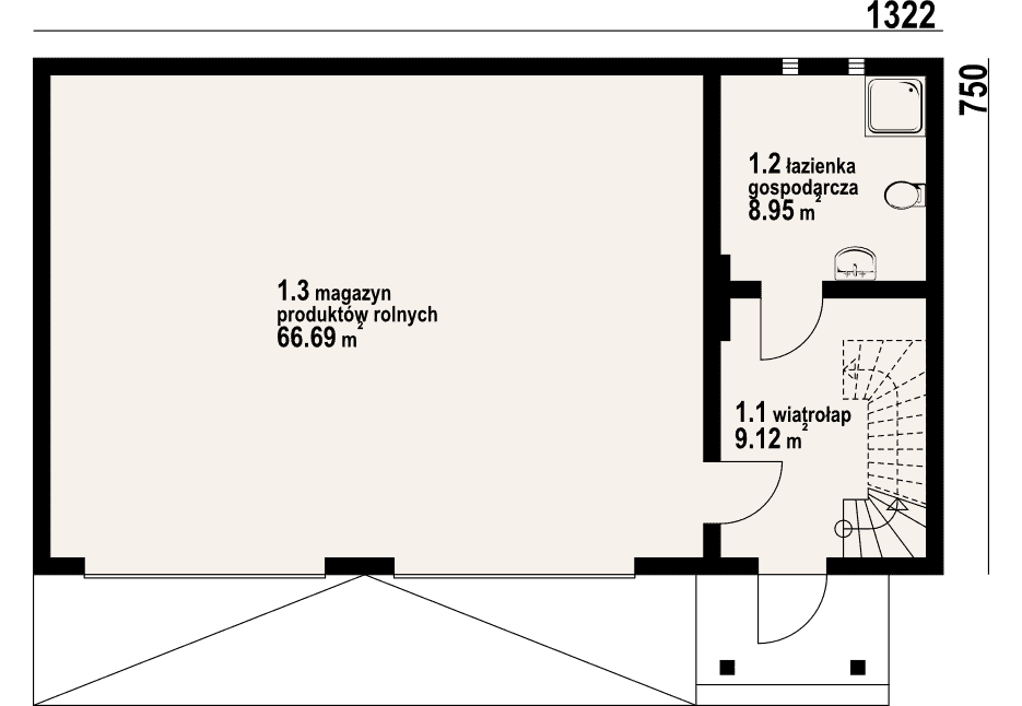 Budynek gospodarczy. - magazyn produktów rolnych z łazienką gospodarczą i schodami na poddasze. Na poddaszu strych.Rzuty