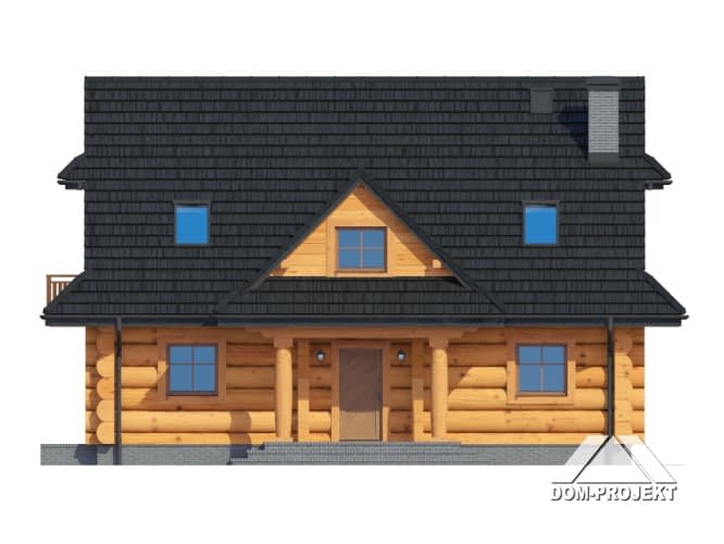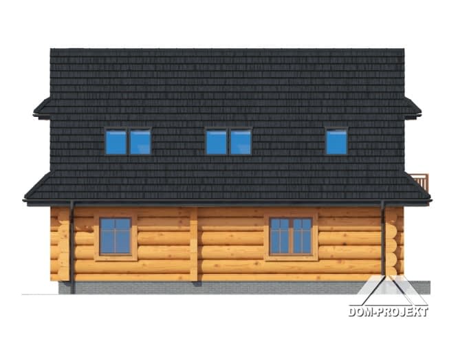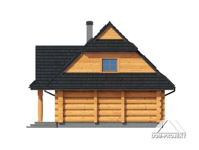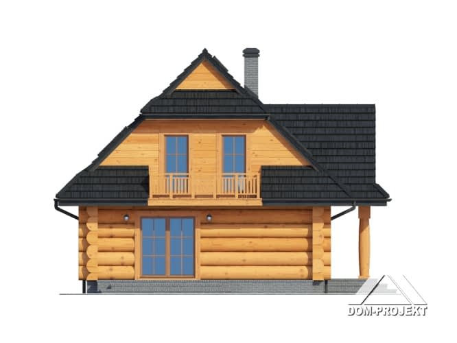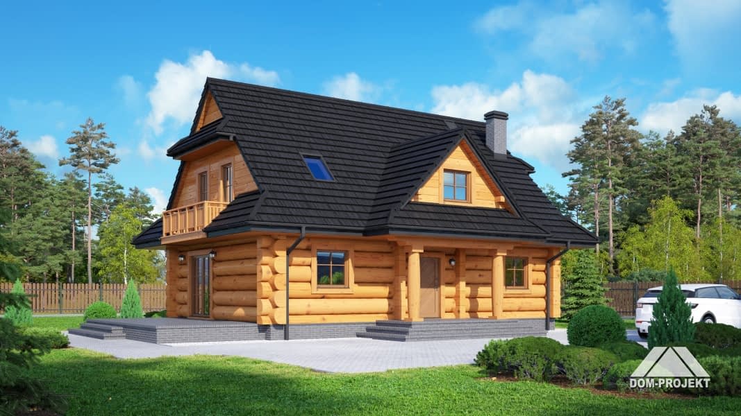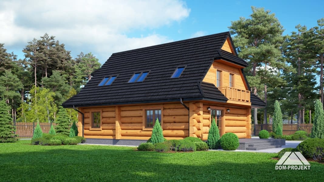 Dom z bali drewnianych. Duży salon z aneksem kuchennym i wyjściem na taras. Pokój, łazienka, wiatrołap i komunikacja. Na poddaszu cztery pokoje, łazienka, garderoba i komunikacja. Zwarta bryła budynku i dach dwuspadowy sprzyjają szybkiej i taniej budowie i niskim kosztom eksploatacji.Rzuty