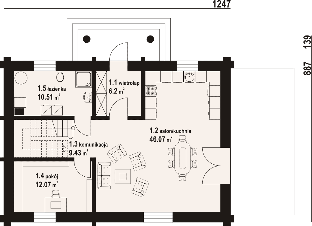 - 1.2 - kuchnia, salon46.07 m²