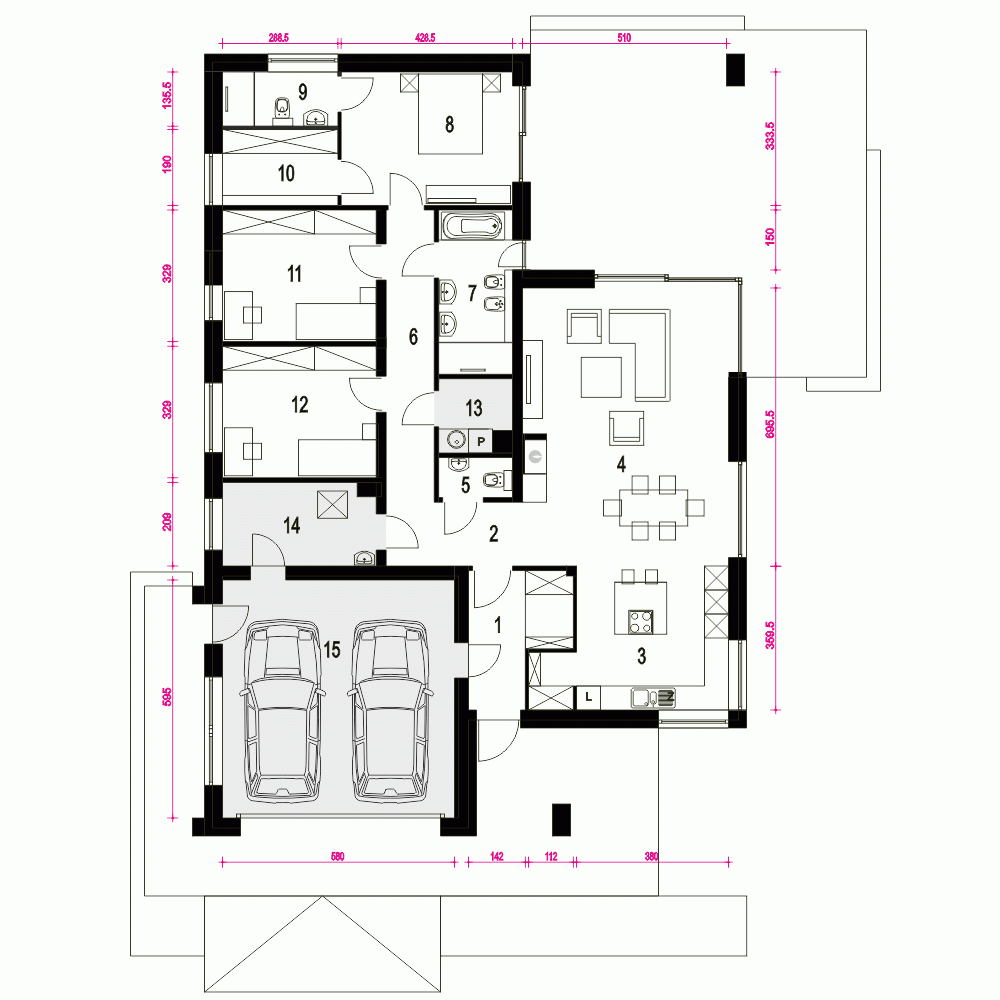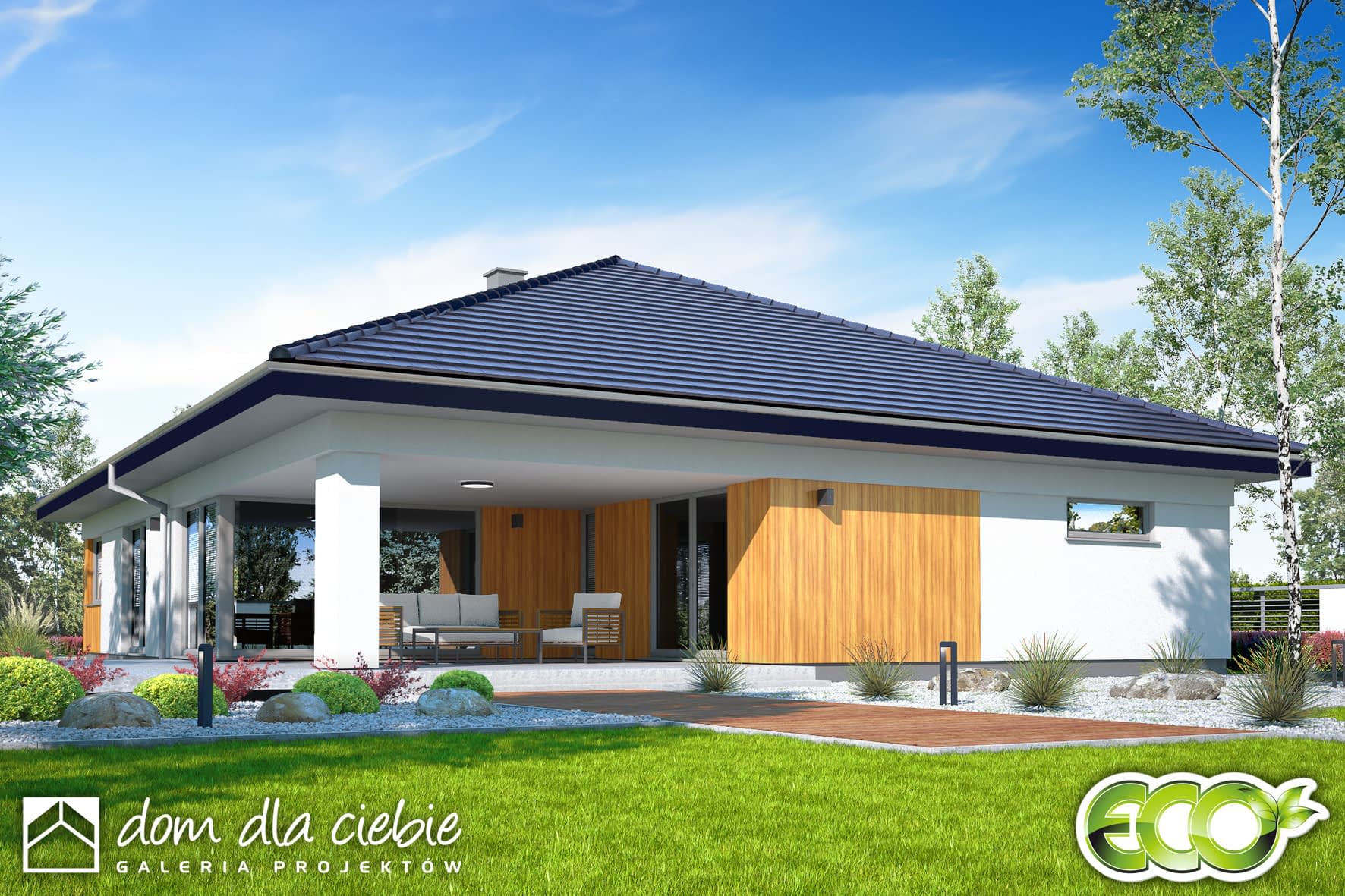 Projekt domu jednorodzinnego Bursztyn II A1 powstał jako wariant ze zmienioną geometrią dachu wariantu A. To propozycja wygodnego parterowego domu z dachem wielospadowym i dwustanowiskowym garażem. Projekt przewidziany jest dla czteroosobowej rodziny. Bursztyn II posiada sporych rozmiarów strefę dzienną (z dużym salonem z wyjściem na obszerny,zadaszony taras, dużą kuchnią z wyspą, sporą spiżarnią i WC dla gości) oraz funkcjonalną strefę nocną, na którą składają się: 3 sypialnie-w tym jedna posiada wewnętrzną łazienkę i garderobę, duża łazienka z oknem, pralnia oraz kotłownia z przejściem do garażu. Podcień z przodu domu chroni wejście główne przed opadami. Sporych rozmiarów kotłownia pomieści piec na paliwo stałe.