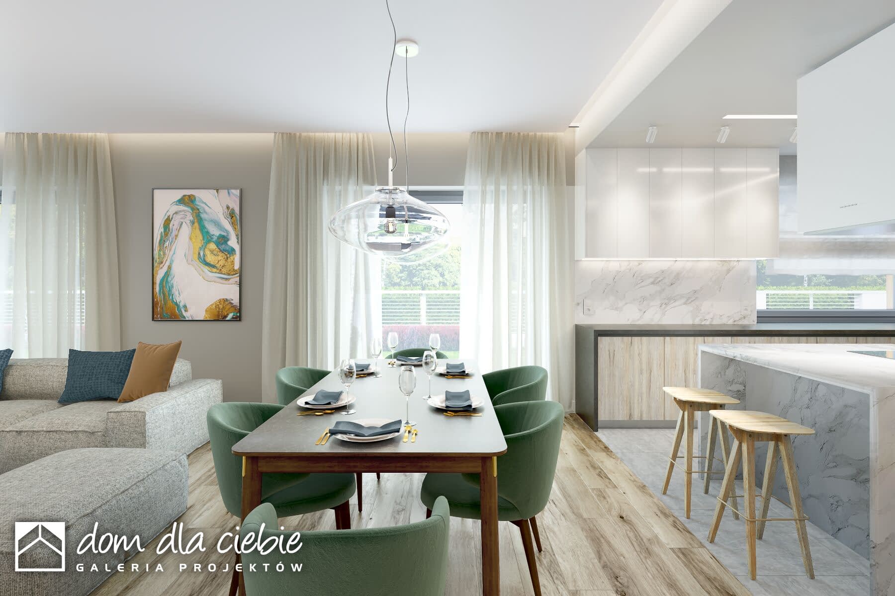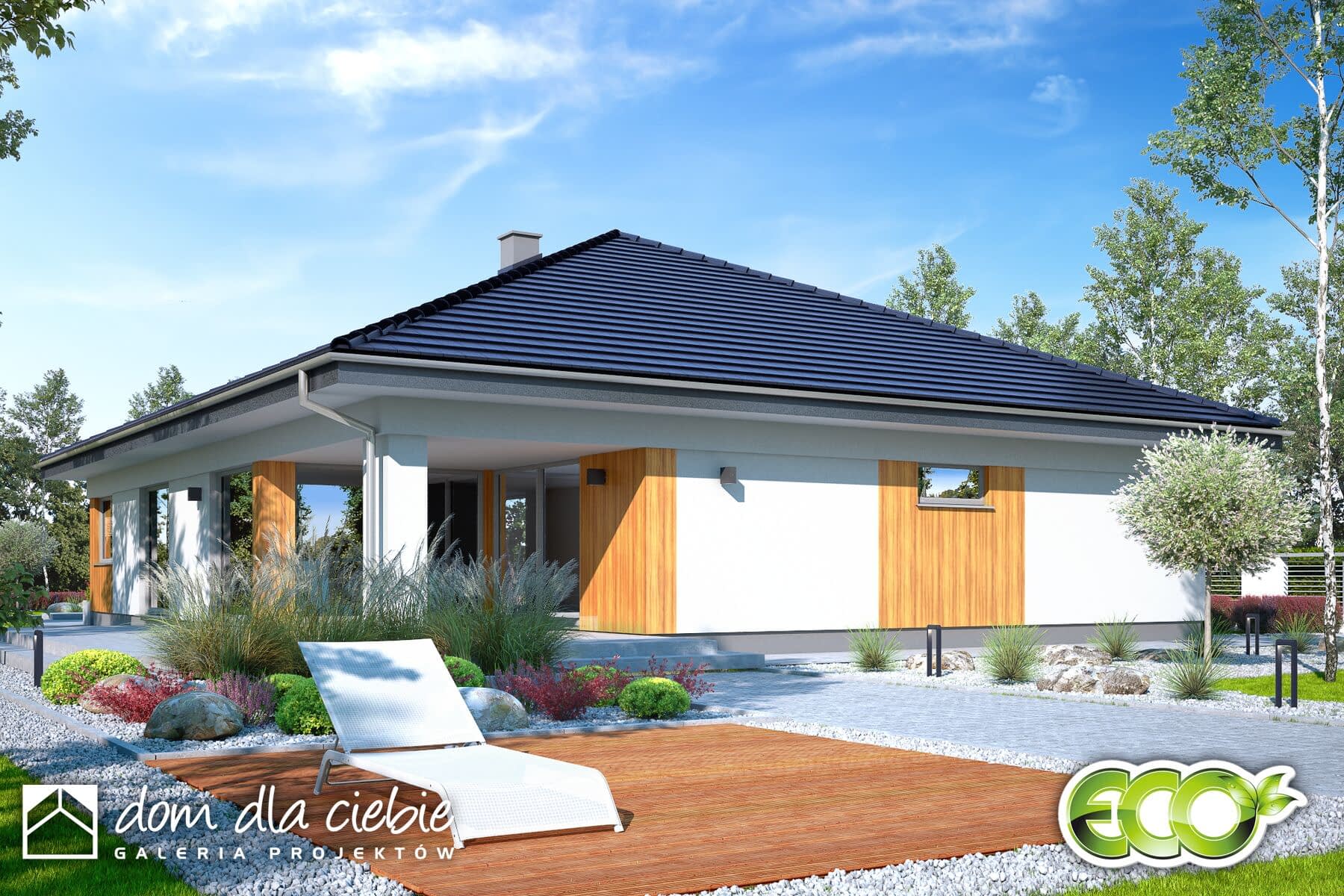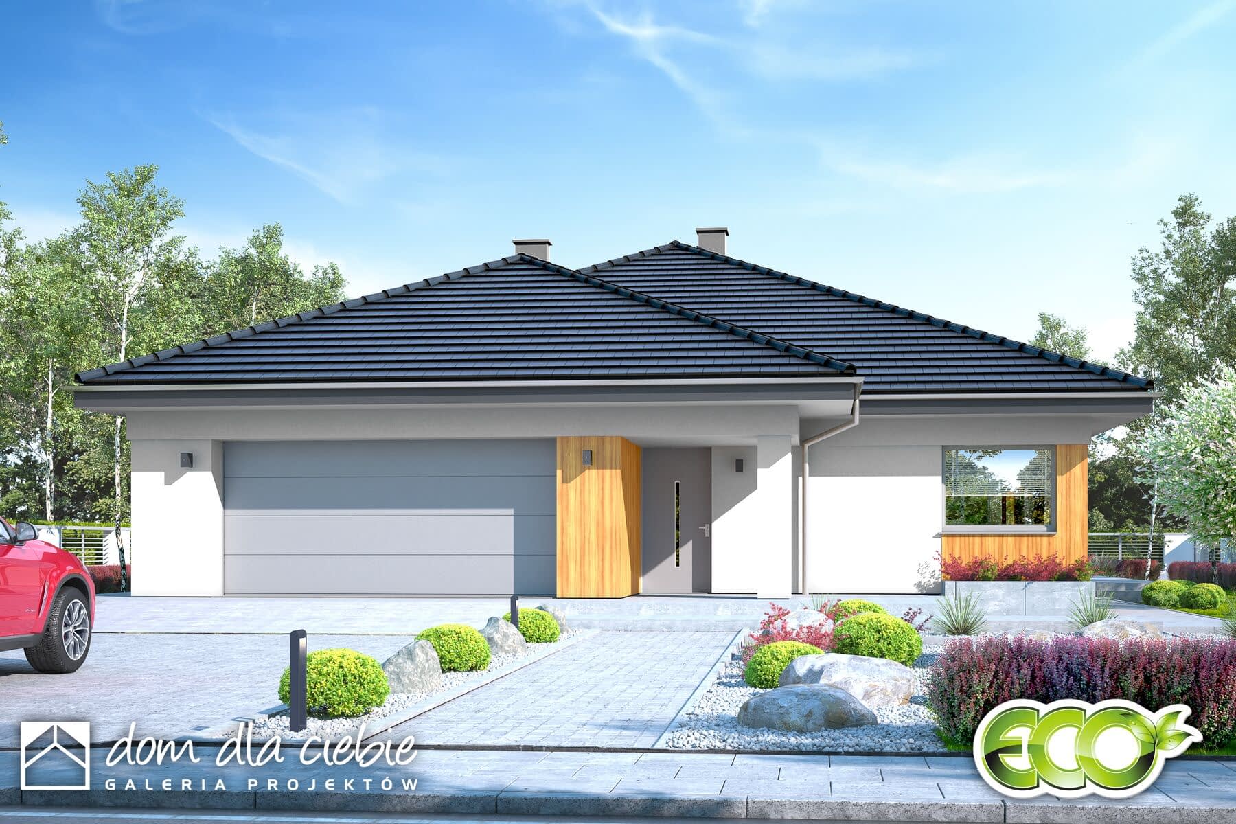 Projekt domu jednorodzinnego, parterowego dla 4- osobowej rodziny. Strefa dzienna w projekcie to: salon, kuchnia z wyspą i spiżarnią oraz wc dla gości. Strefa nocna zawiera 3 sypialnie w tym jedną z własną łazienką i garderobą, spora łazienka oraz pralnia i kotłownia z przejściem do garażu.