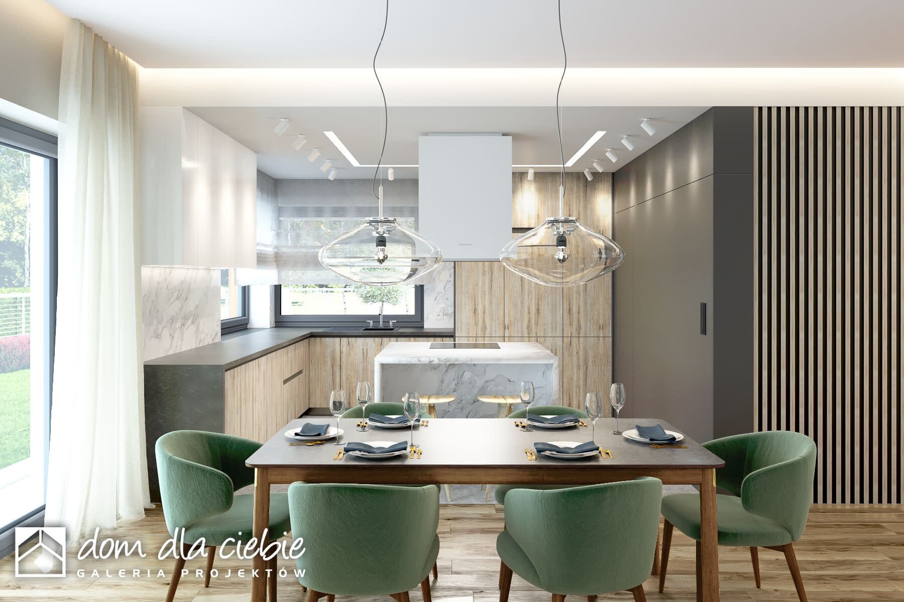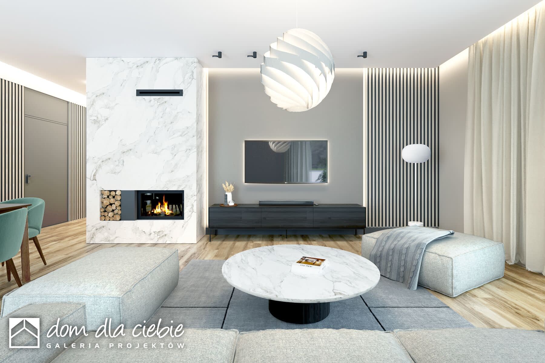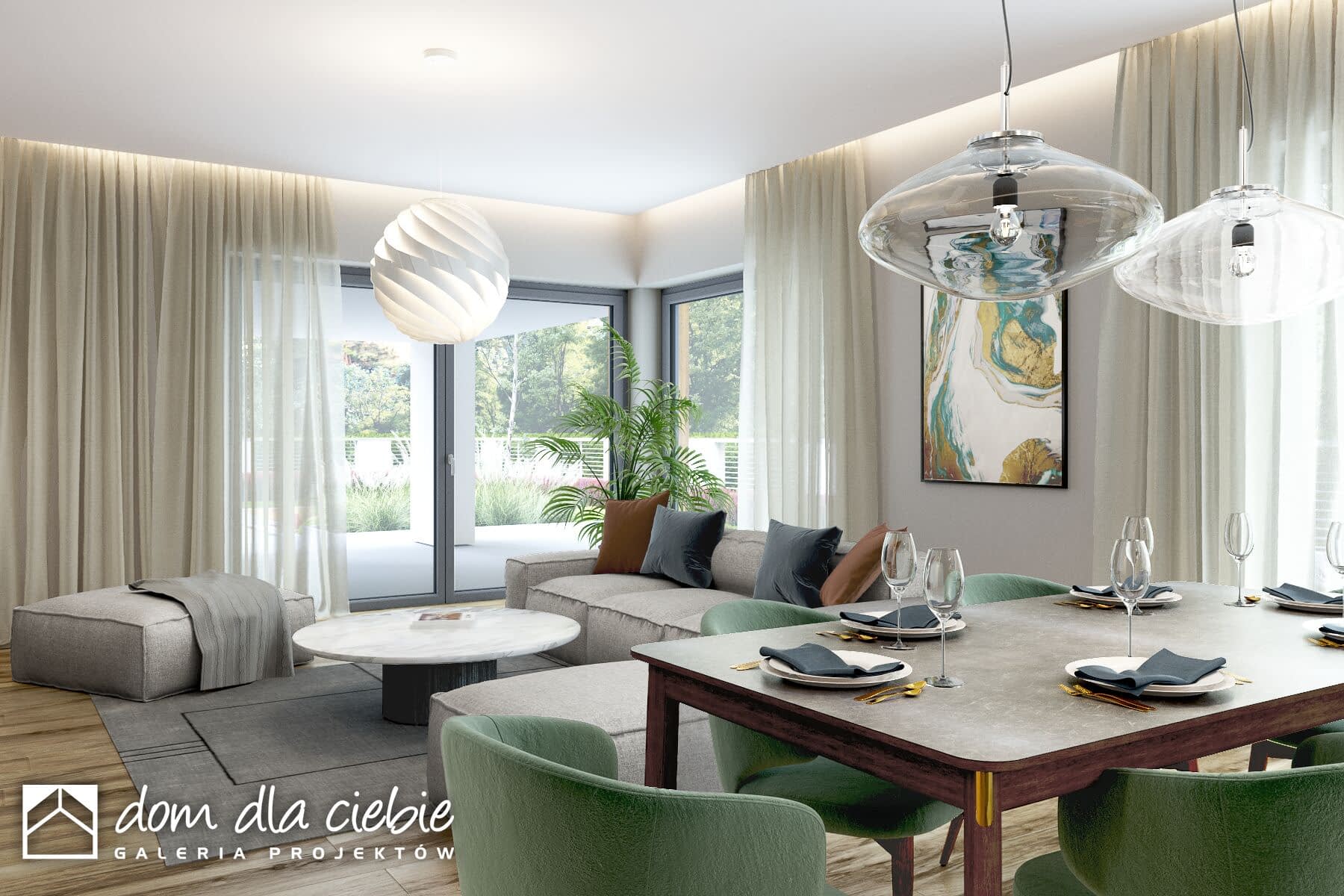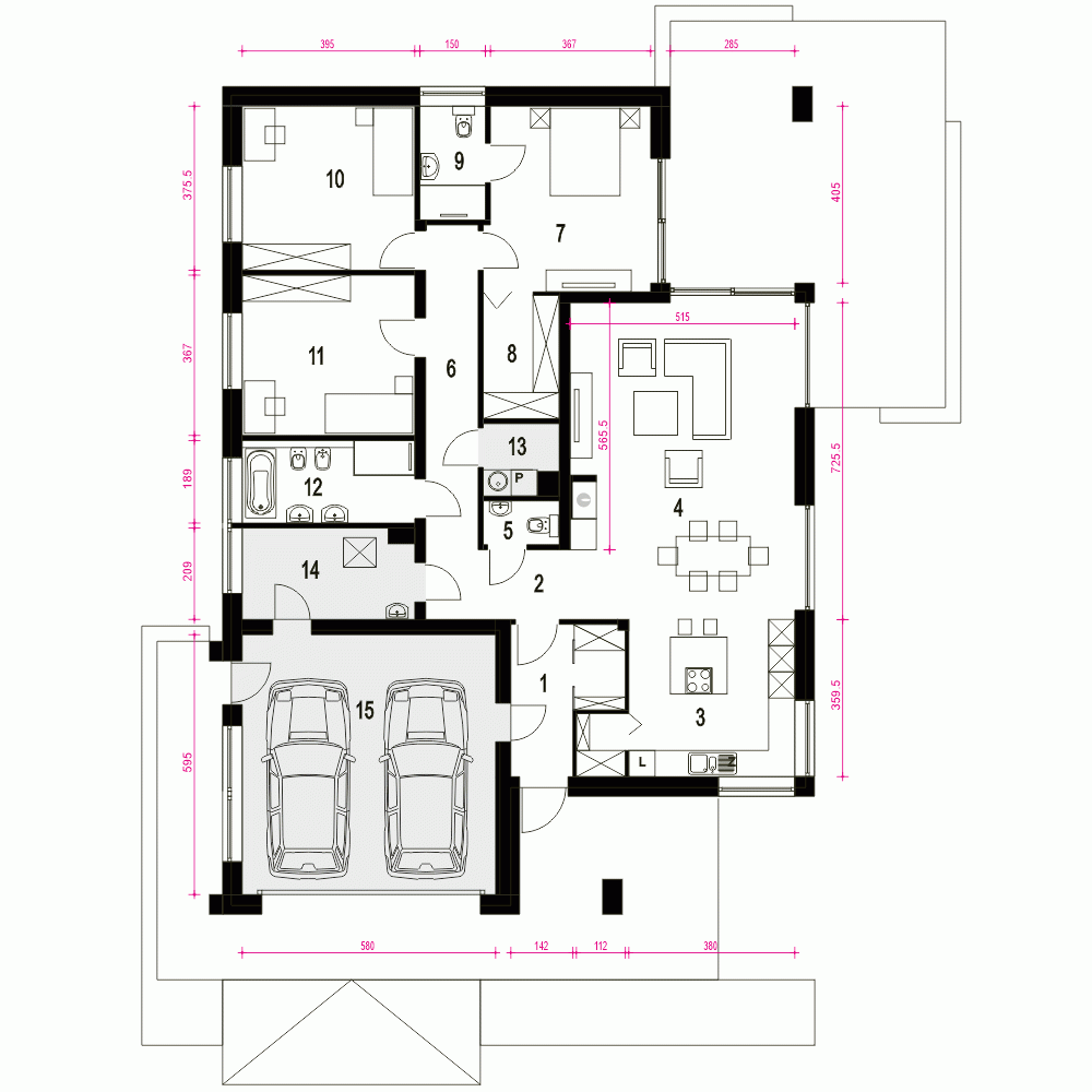 Projekt domu jednorodzinnego, parterowego dla 4- osobowej rodziny. Strefa dzienna w projekcie to: salon, kuchnia z wyspą i spiżarnią oraz wc dla gości. Strefa nocna zawiera 3 sypialnie w tym jedną z własną łazienką i garderobą, spora łazienka oraz pralnia i kotłownia z przejściem do garażu.