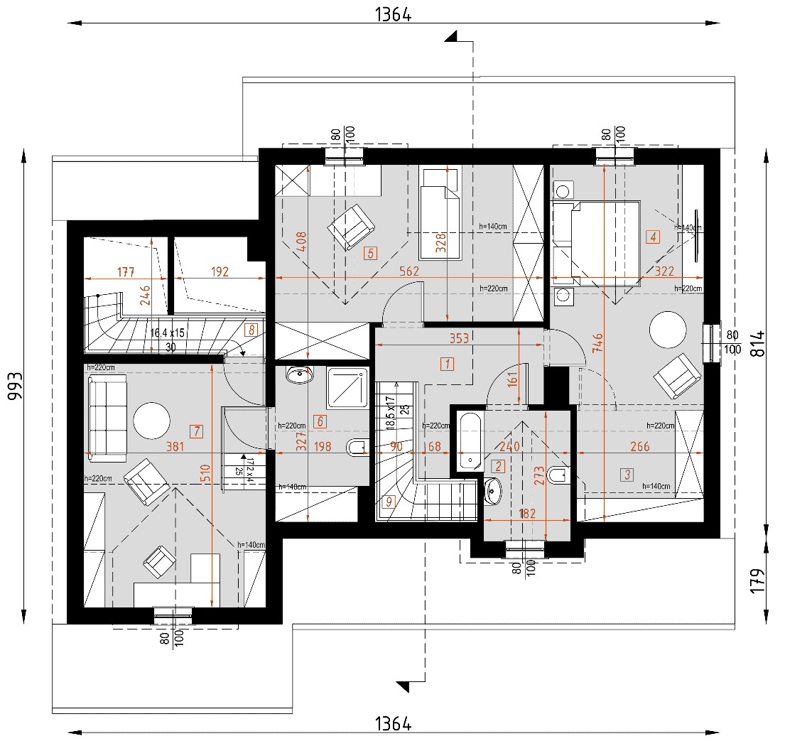 - rzuty wszystkich kondygnacji (np. parter, piwnica, piętro) – rozmieszczenie i wymiary wszystkich pomieszczeń, rozmieszczenie i wielkość otworów okiennych i drzwiowych, rozmieszczenie kominów, sugerowana aranżacja wnętrz.