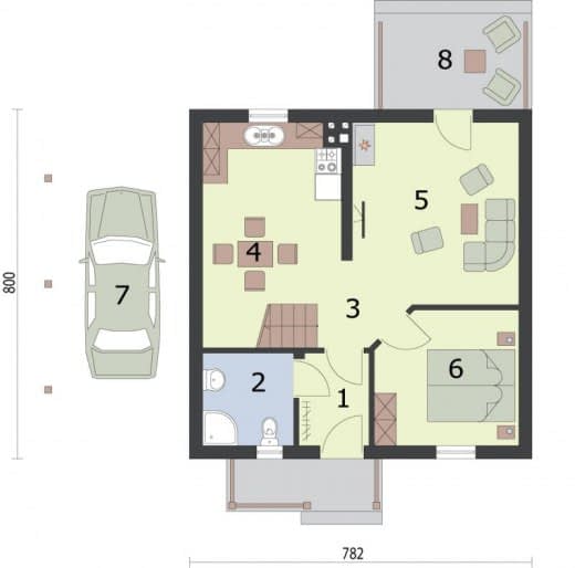 Kolejny z naszych domów letniskowych to świetna propozycja dla rodzin. Niewątpliwą zaletą Calgary jest przestrzeń na piętrze, której znaczna część, czyli ok. 20 m2 ma powyżej metra 1,90. Można ją zagospodarować według uznania. Poza tym, do walorów tego budynku można zaliczyć wiatę samochodową, kopertowy dach oraz zgrabne i przemyślane wnętrza, które sprawiają, że Calgary może się podobać wszystkim rodzinom z dziećmi. Weranda wiedzie do wiatrołapu, z którego przechodzi się do komunikacji. Po lewej stronie znajduje się łazienka, natomiast po prawej stronie komunikacji jest dość obszerna sypialnia. Od komunikacji na wprost usytuowana jest kuchnia, za ścianą znajdziemy pokój dzienny wyposażony w kominek. Jest to miejsce, które z pewnością w zimowe wieczory będzie skupiać życie wypoczywających w domu ludzi. Z tego pokoju można wyjść na taras, będzie można w nim w letnie dni spędzać czas w biesiadnej atmosferze, przy grillu na tarasie, usytuowanym od wschodu.