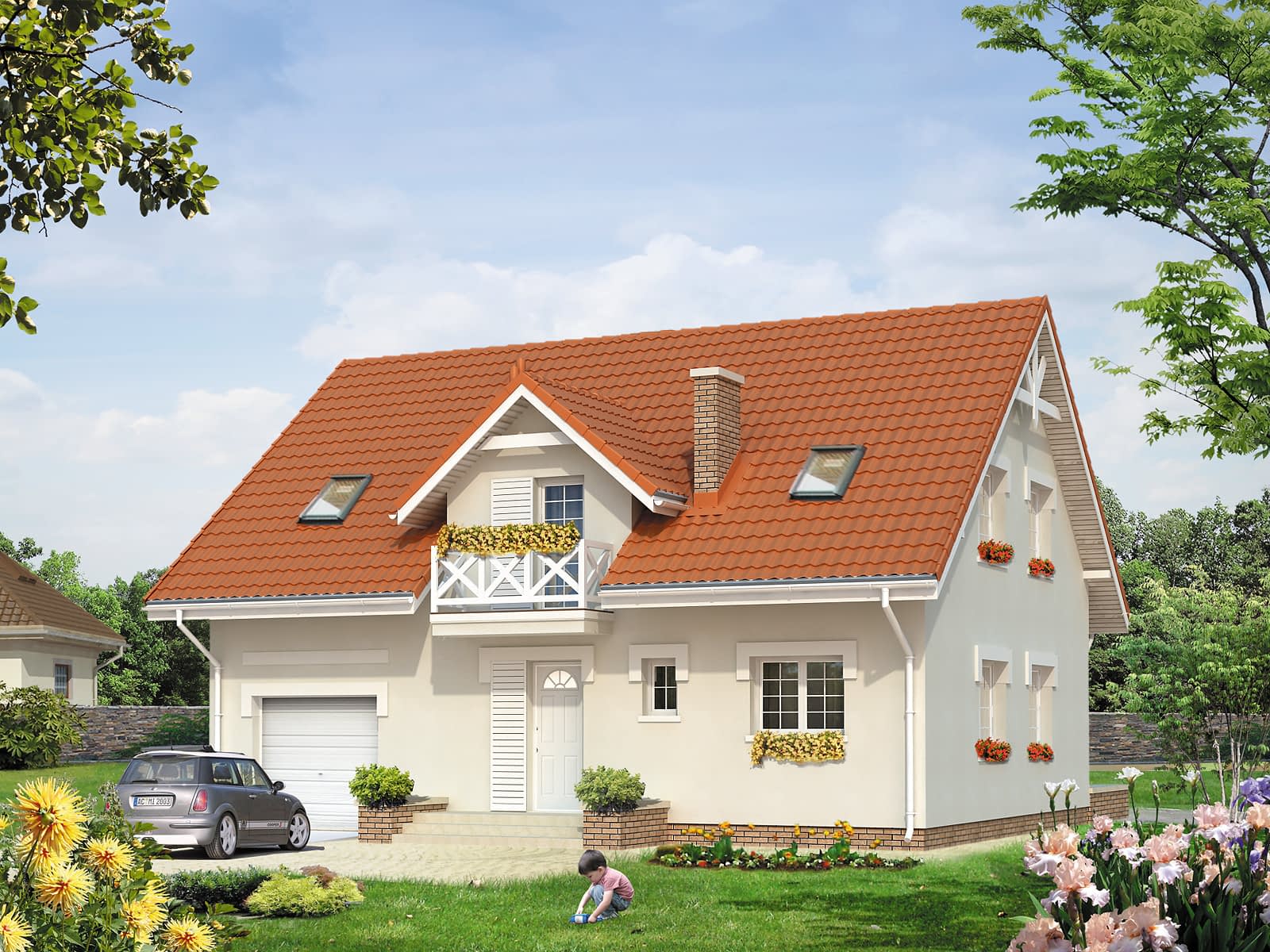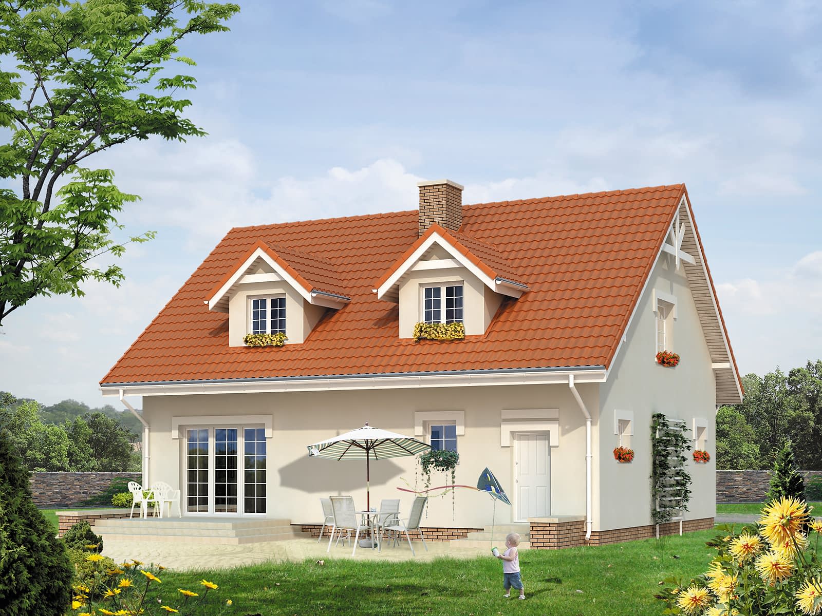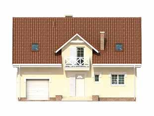 Dom jednorodzinny z poddaszem użytkowym dla 3 – 4-osobowej rodziny. Garaż wkomponowany w bryłę domu. Kotłownia na paliwo stałe ze składem opału. Na poddaszu znajdują się trzy sypialnie, łazienka oraz garderoba.Konstrukcja