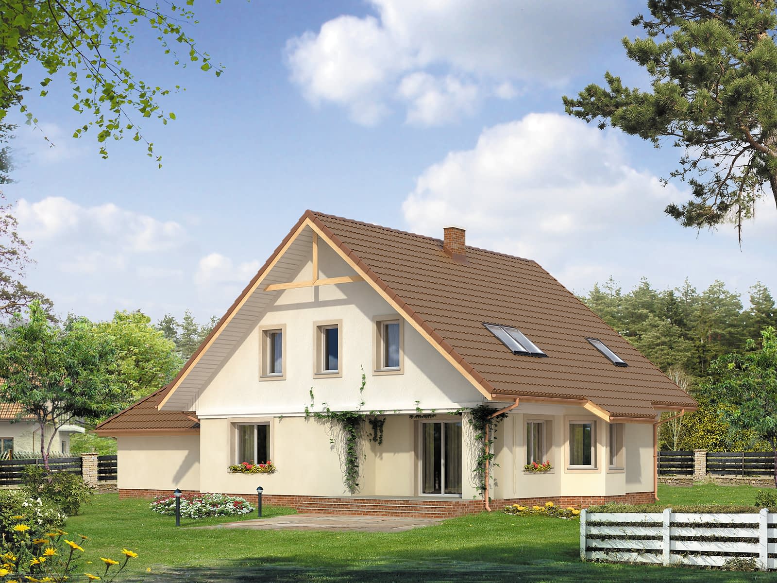 Ściany: 2-warstwowe - pustak ceramiczny + styropian, Stropy: żelbetowe, wylewane, Dach: dachówka ceramiczna,Rzuty