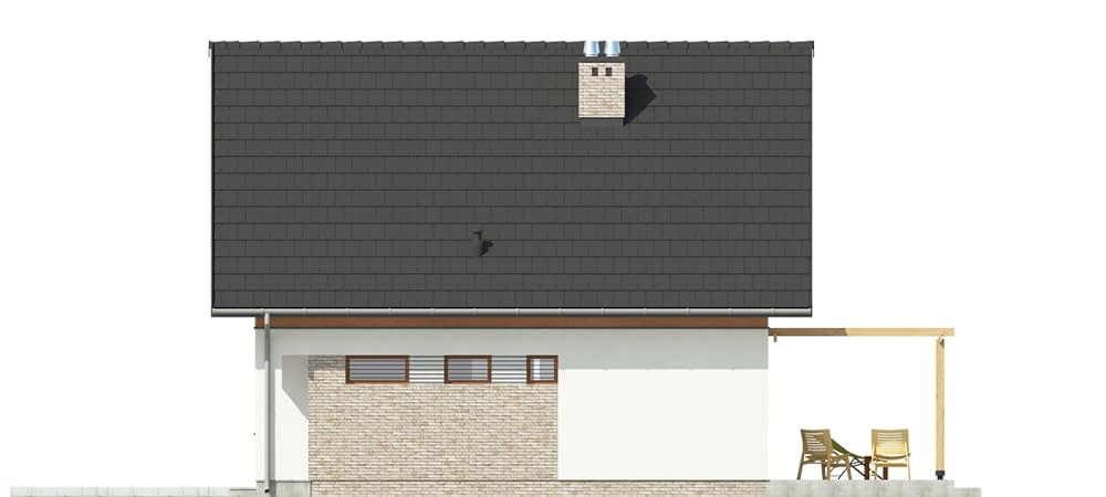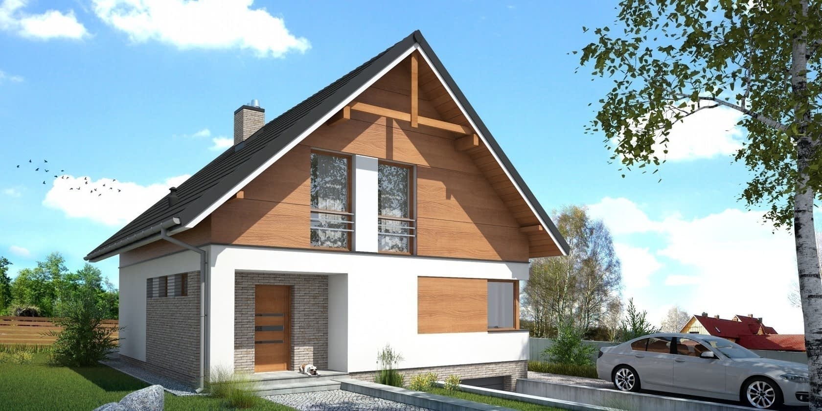 Niewielki dom jednorodzinny, wolnostojący, podpiwniczony z poddaszem użytkowym i garażem jednostanowiskowym.