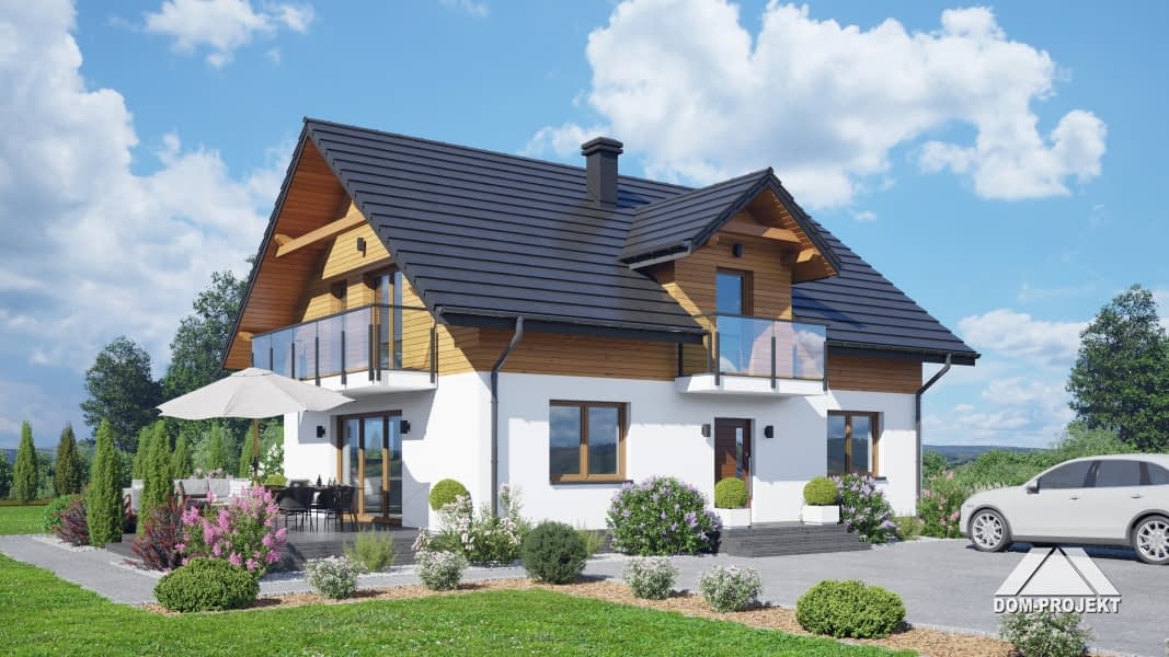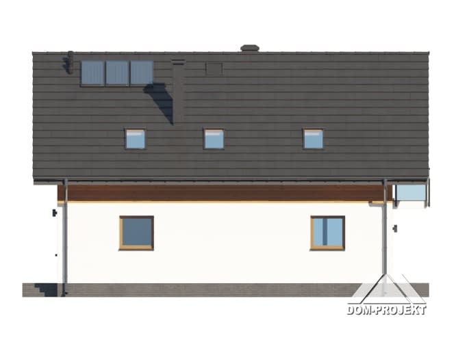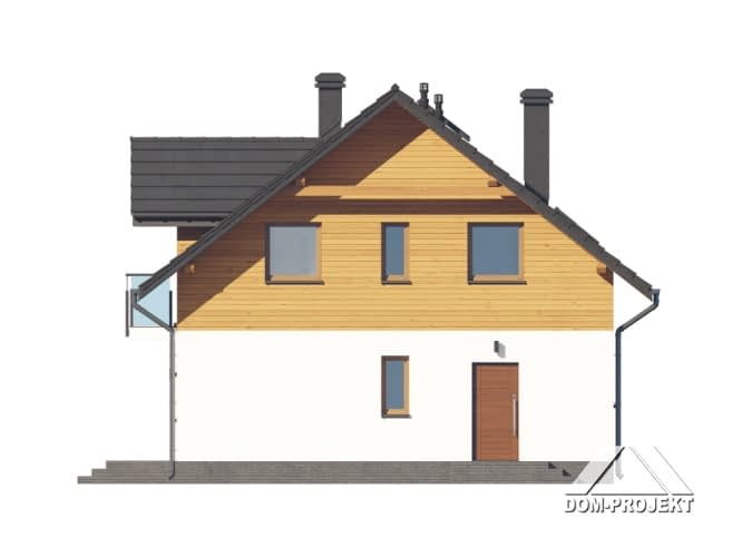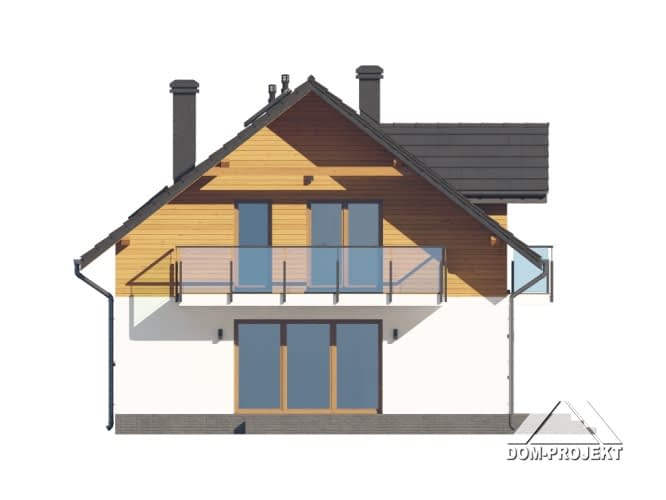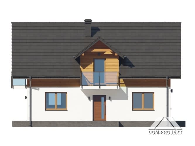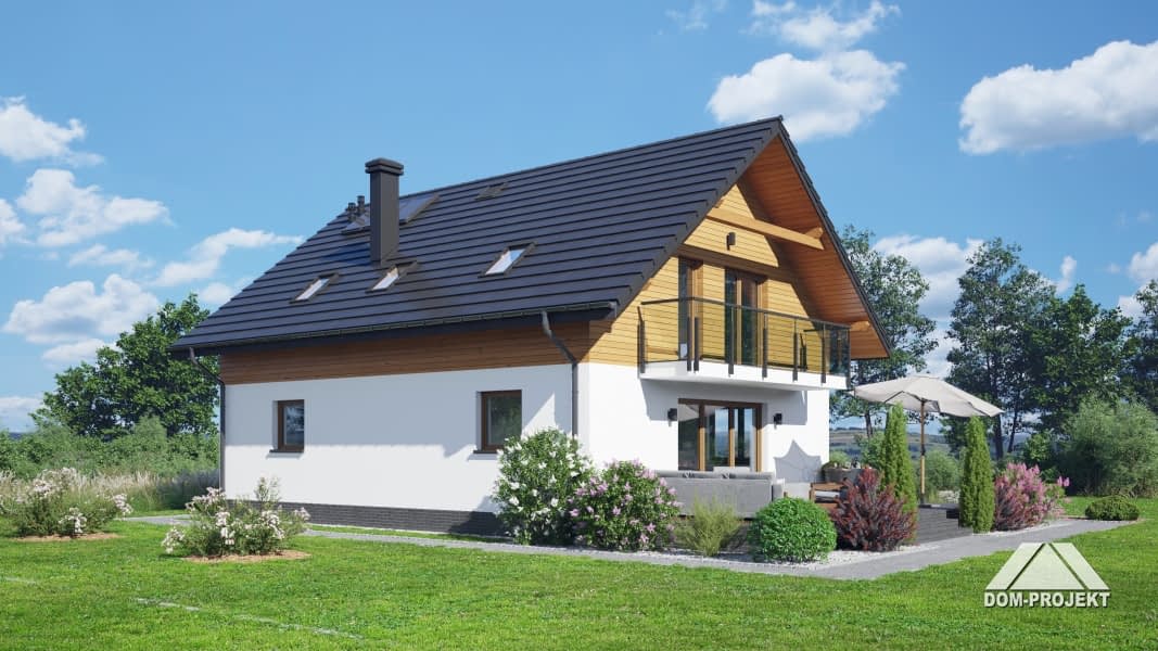 Dom z poddaszem użytkowym. Na parterze salon z aneksem kuchennym, kominkiem oraz wyjściem na taras. Pokój, łazienka, kotłownia, komunikacja, wiatrołap. Na poddaszu cztery pokoje ( jeden z własną garderobą), łazienka, komunikacja, dwa balkony. Zwarta bryła budynku oraz dach dwuspadowy sprzyjają szybkiej i taniej budowie oraz niskim kosztom eksploatacji.Rzuty