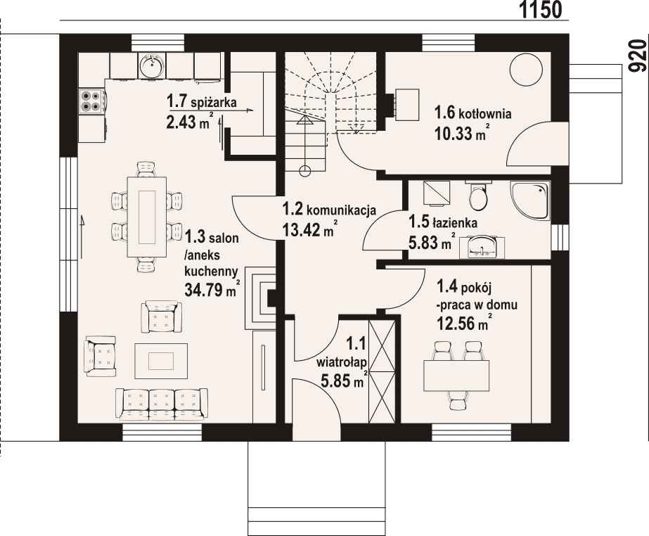 - 1.3 - salon z aneksem kuchennym34.79 m²