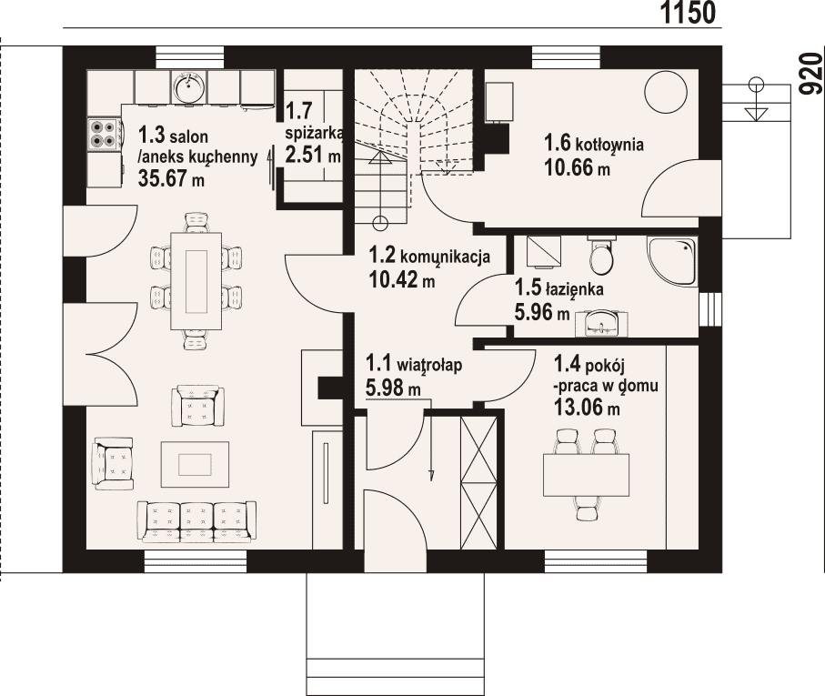 - 1.3 - salon z aneksem kuchennym35.67 m²
