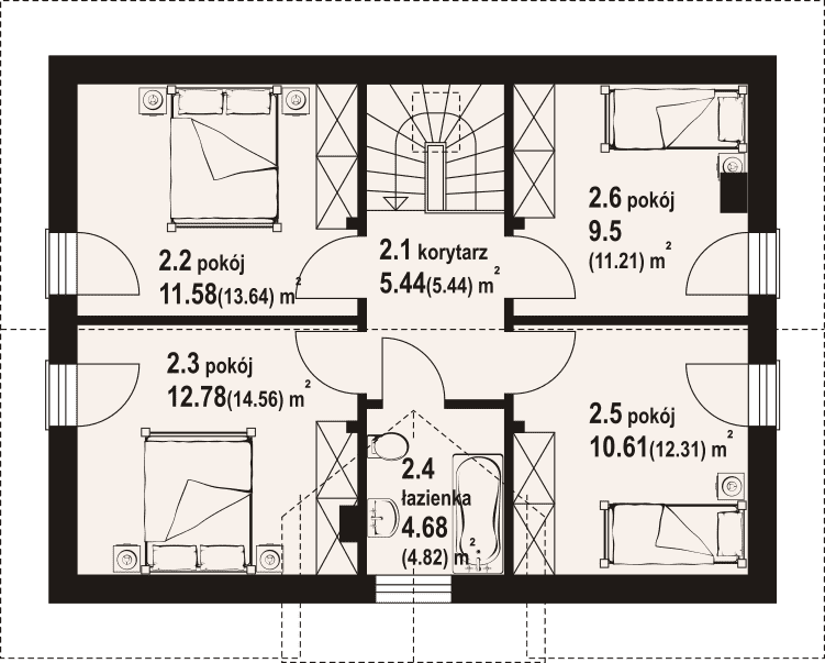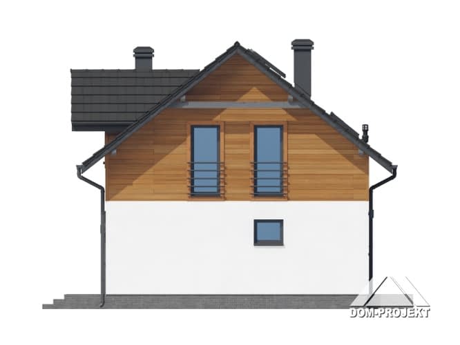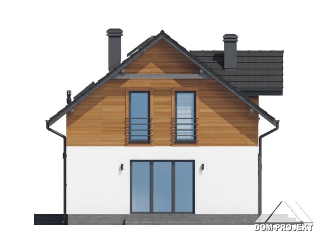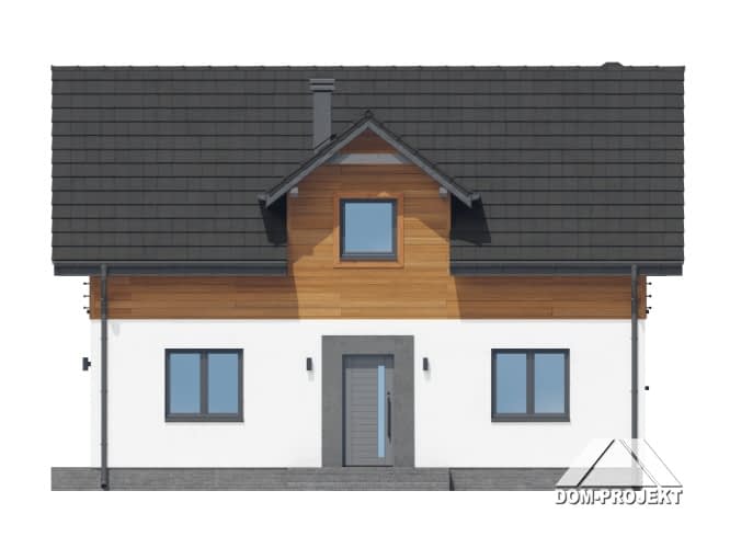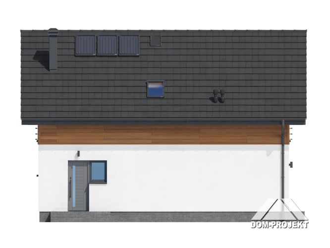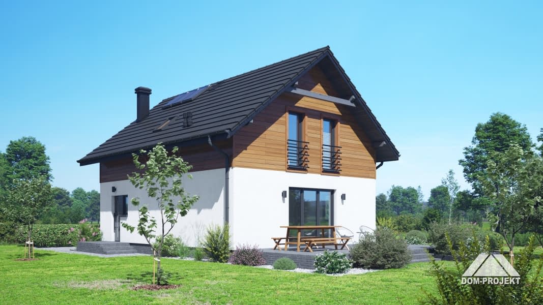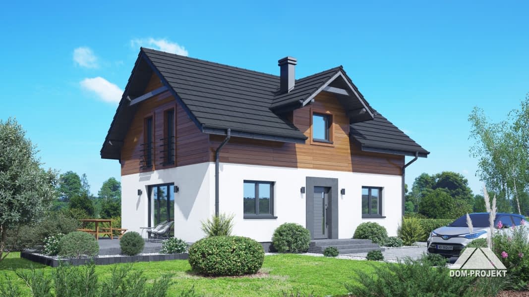 Dom z poddaszem użytkowym. Na parterze salon z aneksem kuchennym, kominkiem oraz wyjściem na taras. Spiżarka, komunikacja, kotłownia, łazienka, wiatrołap, pokój do pracy. Na poddaszu cztery pokoje, korytarz, łazienka. Zwarta bryła budynku oraz dach dwuspadowy sprzyjają szybkiej i taniej budowie oraz niskim kosztom eksploatacji.Rzuty