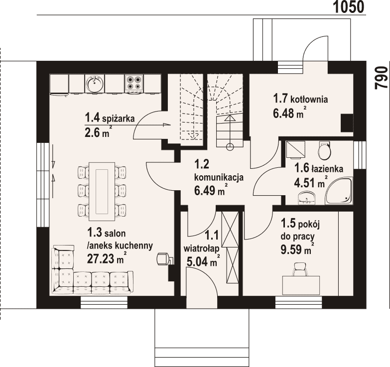 - 1.3 - salon z aneksem kuchennym27.23 m²