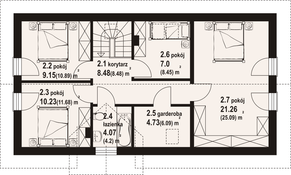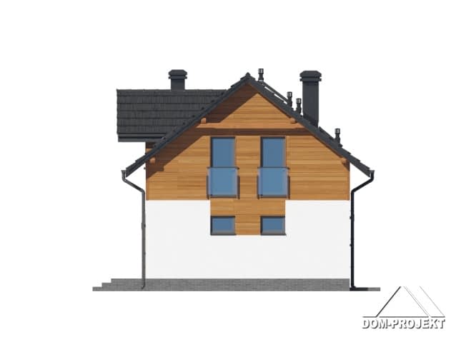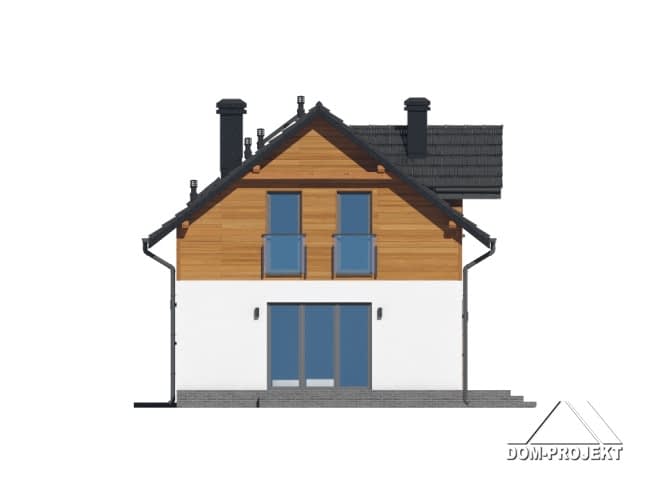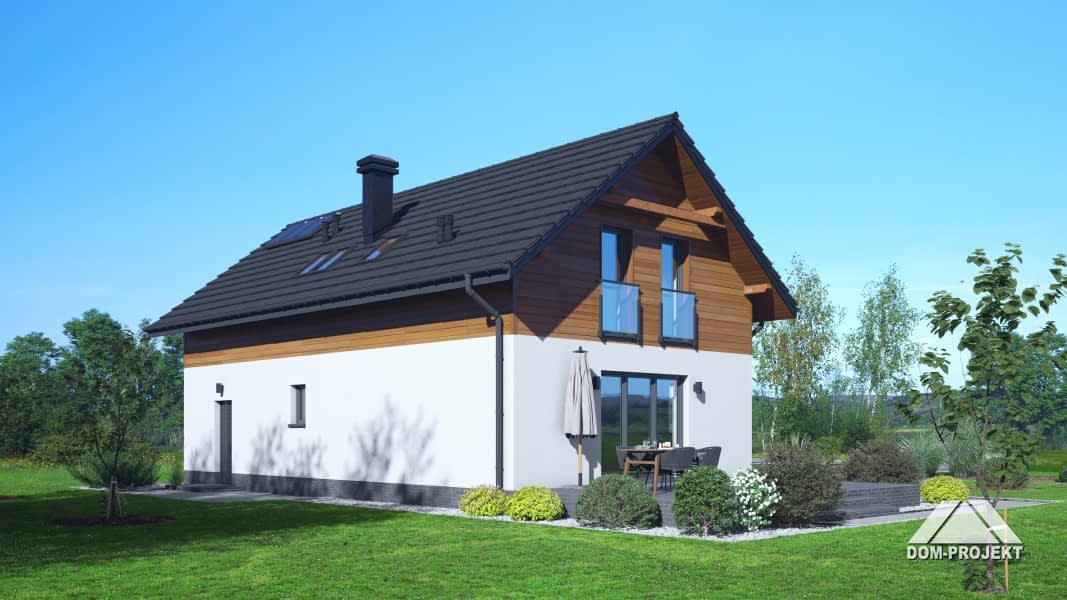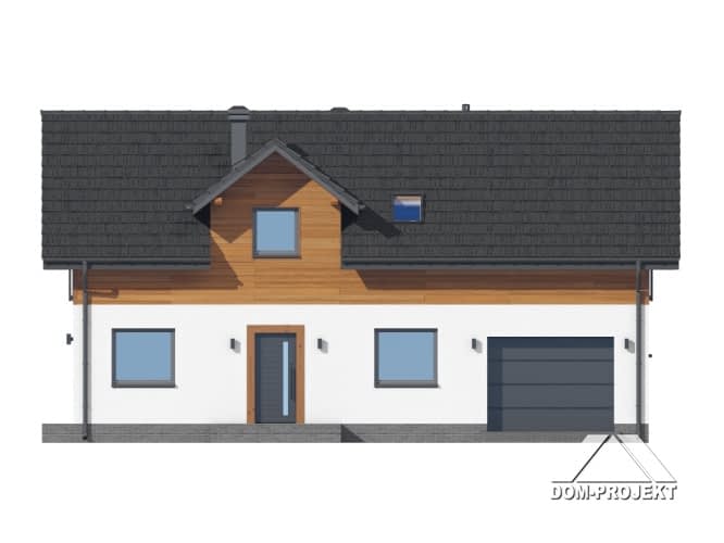 Dom z poddaszem użytkowym. Na parterze salon z aneksem kuchennym oraz wyjściem na taras. Komunikacja, wiatrołap, pokój do pracy, wc, kotłownia, garaż. Na poddaszu cztery pokoje, łazienka, garderoba, korytarz. Zwarta bryła budynku oraz dach dwuspadowy sprzyjają szybkiej i taniej budowie oraz niskim kosztom eksploatacji.Rzuty