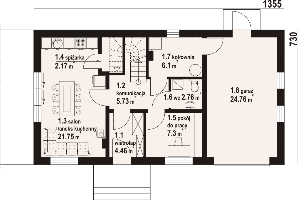 - 1.3 - salon z aneksem kuchennym21.75 m²