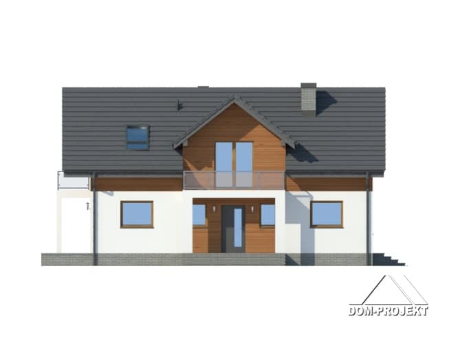Wygodny dom z poddaszem mieszkalnym. Duży salon z aneksem kuchennym, kominkiem i wyjściem na taras. Pokój, łazienka, spiżarka, wiatrołap i kotłownia. Na poddaszu trzy pokoje, dwie łazienki i schowek. Zwarta bryła budynku oraz dach dwuspadowy sprzyjają szybkiej i taniej budowie oraz niskim kosztom eksploatacji.Rzuty