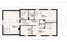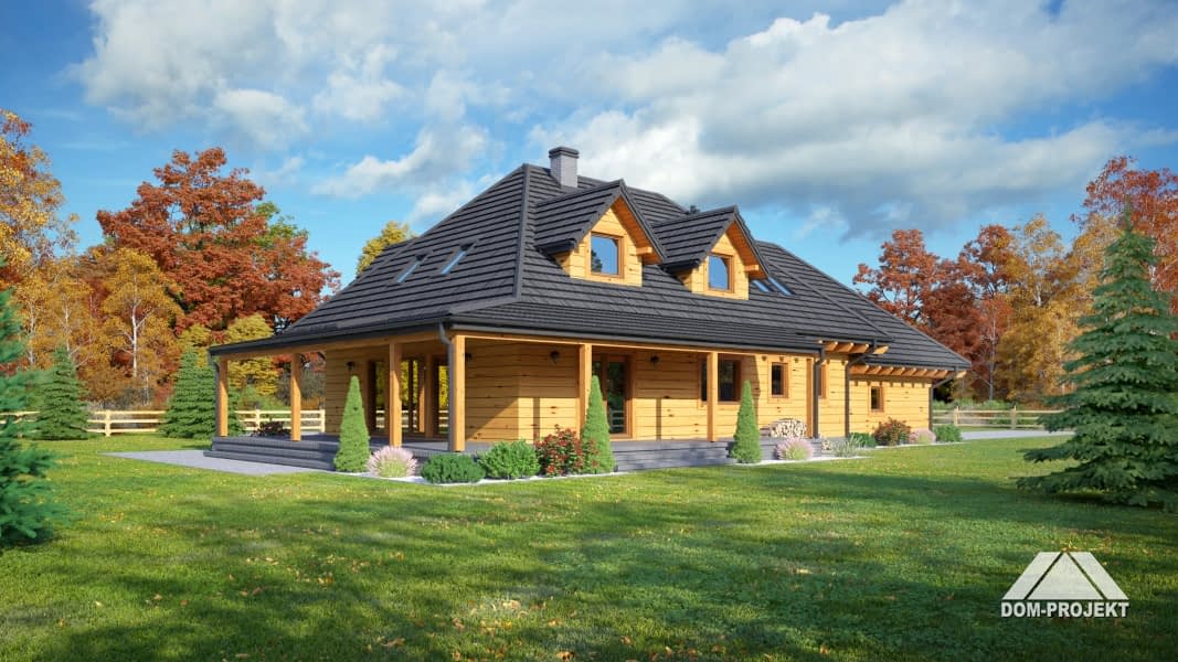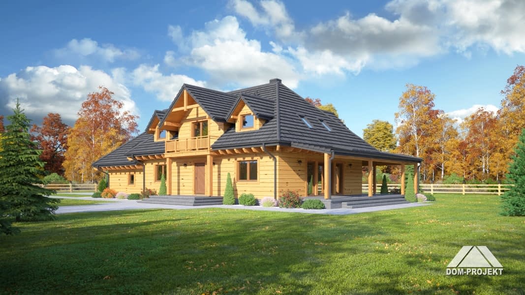 Dom w konstrukcji szkieletu drewnianego. Duży salon z aneksem kuchennym, kominkiem i wyjściem na taras. Pokój, łazienka, pralnia, komunikacja, spiżarka, wiatrołap. Garaż i kotłownia. Na poddaszu trzy pokoje, trzy łazienka, garderoba, komunikacja i balkon.Rzuty