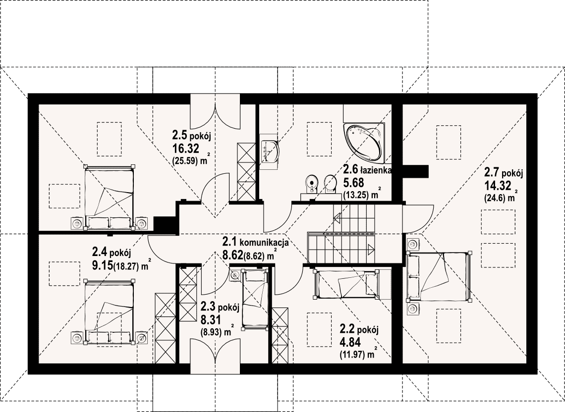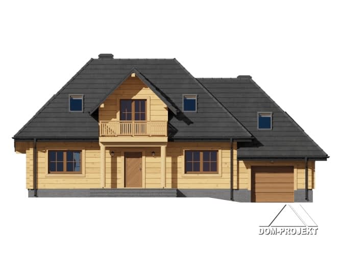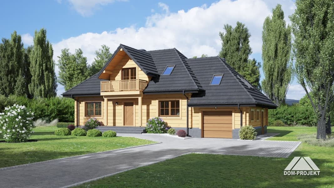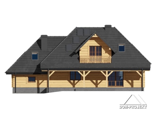 Dom z bali drewnianych. Na parterze salon z kominkiem oraz wyjściem na duży zadaszony taras. Duża kuchnia otwarta na salon. Wiatrołap, pokój , duża łazienka, komunikacja, garaż i kotłownia. Na poddaszu pięć pokoi, komunikacja, łazienka oraz dwa balkony.Rzuty