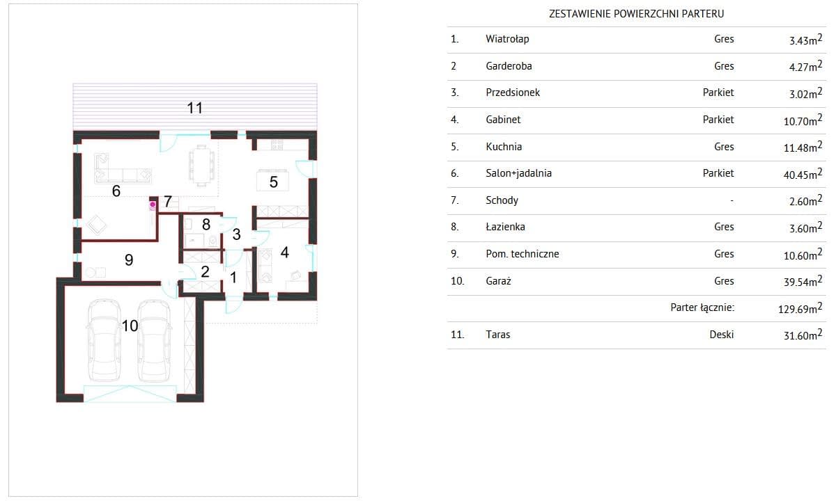 Na parterze zaprojektowano strefę dzienną w postaci wysokiego salonu z wyjściem na taras oraz części niższej salonu z kominkiem, jadalni oraz kuchni. Bezpośrednio z wiatrołapu można przejść do garderoby i dalej do pomieszczenia technicznego i dwustanowiskowego garażu. Na parterze zlokalizowano również gabinet mogący pełnić funkcję dodatkowego pokoju oraz łazienkę z prysznicem.