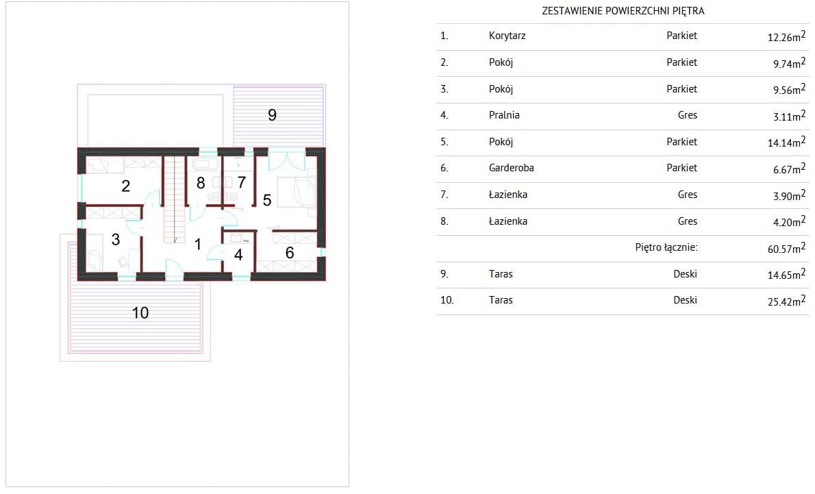 Na piętrze znajdują się 2 pokoje przeznaczone dla dzieci i przynależna im łazienka oraz sypialnia gospodarzy również z oddzielną łazienką i garderobą. Zaprojektowano również dwa tarasy – jeden z wyjściem z sypialni gospodarzy i drugi z wyjściem z korytarza i pokoju dziecka. Nie zapomniano również o pralni/suszarni z wejściem od strony korytarza.