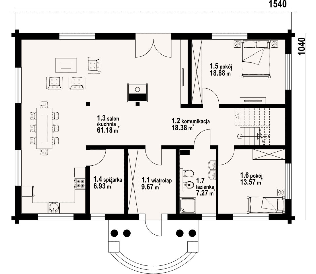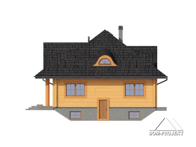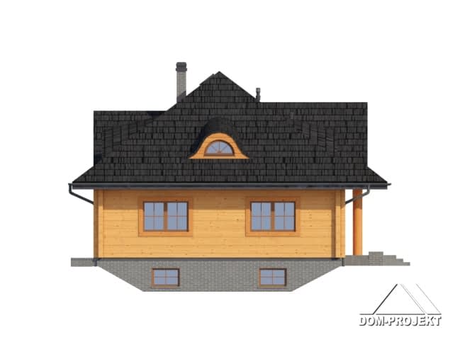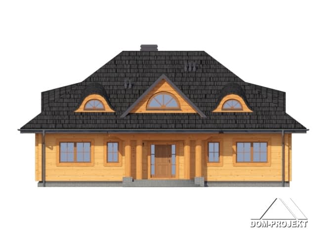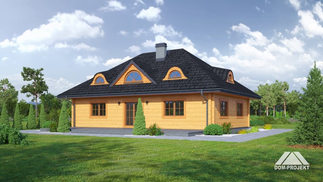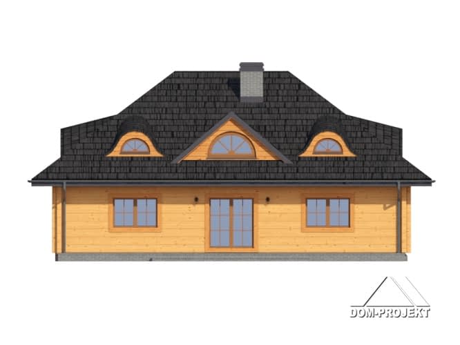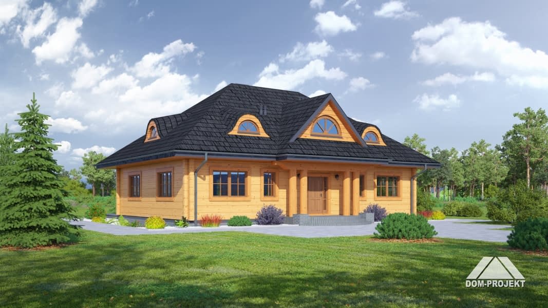 Podpiwniczony dom z bali drewnianych. Duży salon z aneksem kuchennym, kominkiem, wyjściem na taras. Dwa pokoje, łazienka, spiżarka, wiatrołap i komunikacja. Na poddaszu cztery pokoje, łazienka, garderoba i komunikacja. W piwnicach kotłownia, sauna, piwnica, pomieszczenie gospodarcze i komunikacja.Rzuty