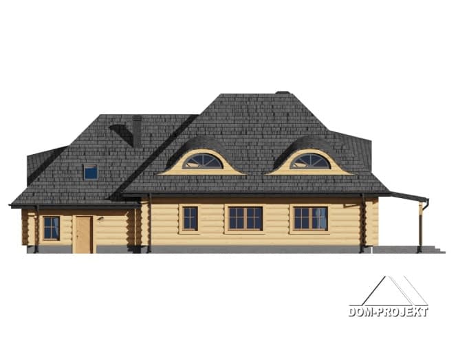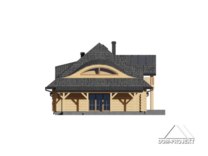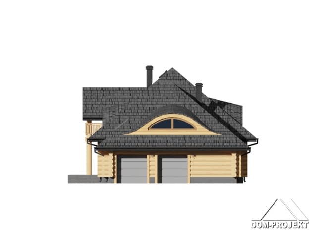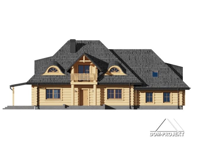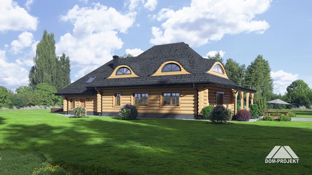 Dom z bali z poddaszem użytkowym. Na parterze duży salon z kominkiem oraz wyjściem na zadaszony taras. Duża kuchnia, pokój, łazienka, wiatrołap, komunikacja, garaż na dwa samochody oraz pomieszczenie gospodarcze. Na poddaszu cztery pokoje, łazienka, komunikacja.Rzuty