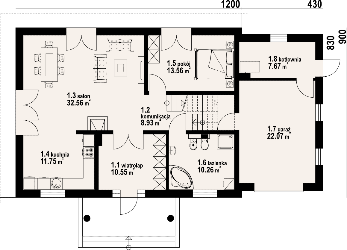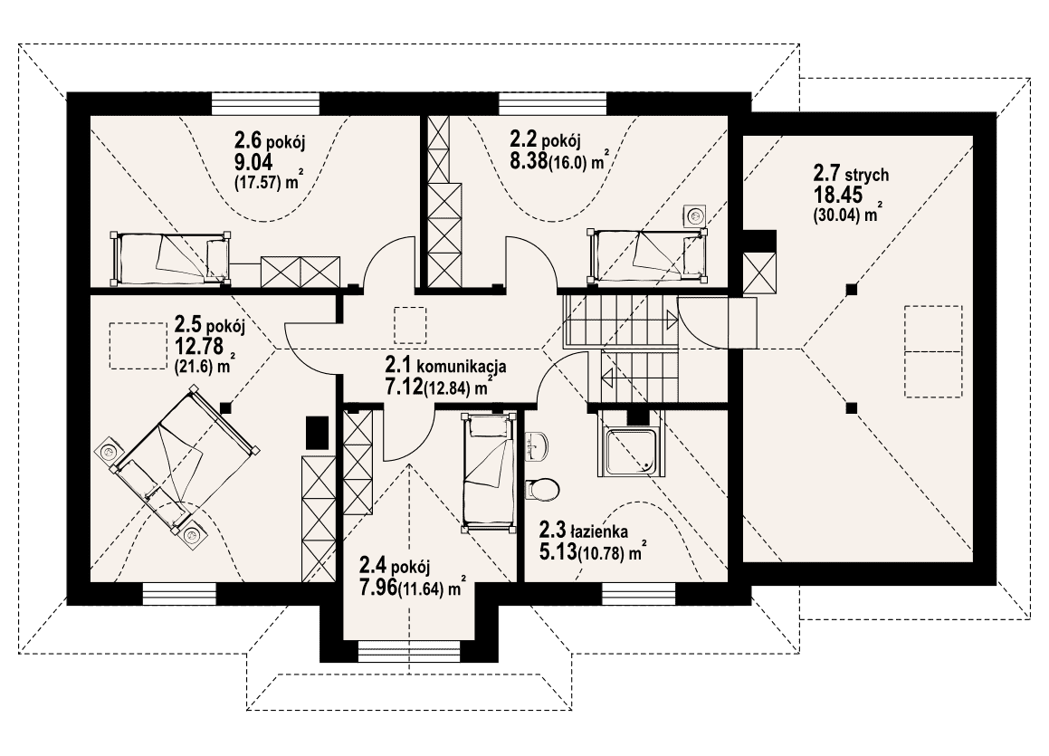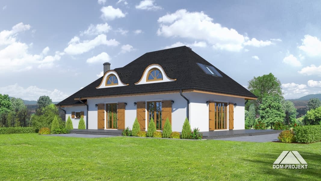 Zewnętrzna architektura domu nawiązuje do tradycji polskich dworków szlacheckich, a wnętrze ma współczesny, wygodny układ funkcjonalny Na parterze domu część dzienna z dużym salonem z kominkiem, wyjściami na taras i otwarciem na dużą i wygodną kuchnię. Wygodny pokój, duża łazienka, duży wiatrołap, zadaszone wejście do domu, garaż i kotłownia. Na poddaszu cztery wygodne pokoje, duża łazienka i duży strych nad garażem, który można wykorzystać na pomieszczenie do rekreacji, lub jako pokój hobby itp. Kolektory słoneczne na dachu będą zapewniały w dużej części zapotrzebowanie na ciepłą wodę w budynku.Rzuty