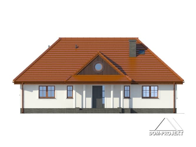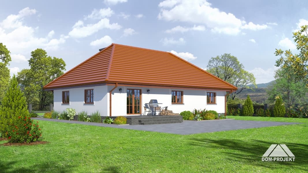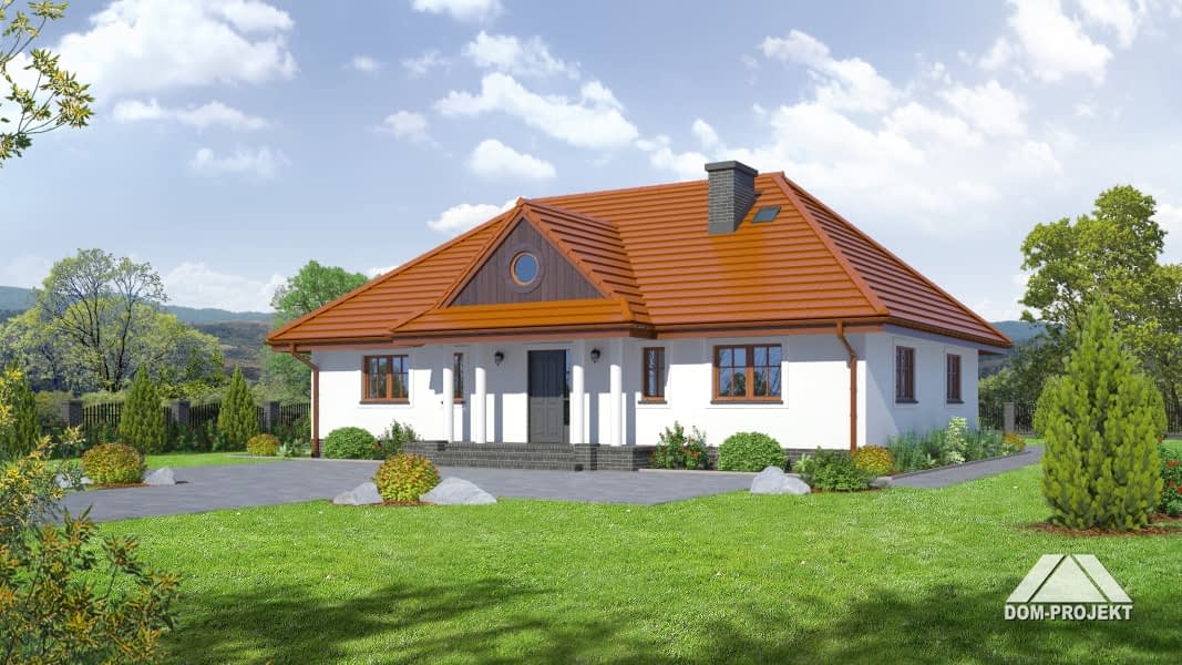 Wygodny dom parterowy. Duży salon i duża kuchnia. W salonie kominek i wyjście na taras. Trzy pokoje, łazienka, wc, kotłownia, wiatrołap, komunikacja. Schody z wiatrołapu na poddasze.Rzuty