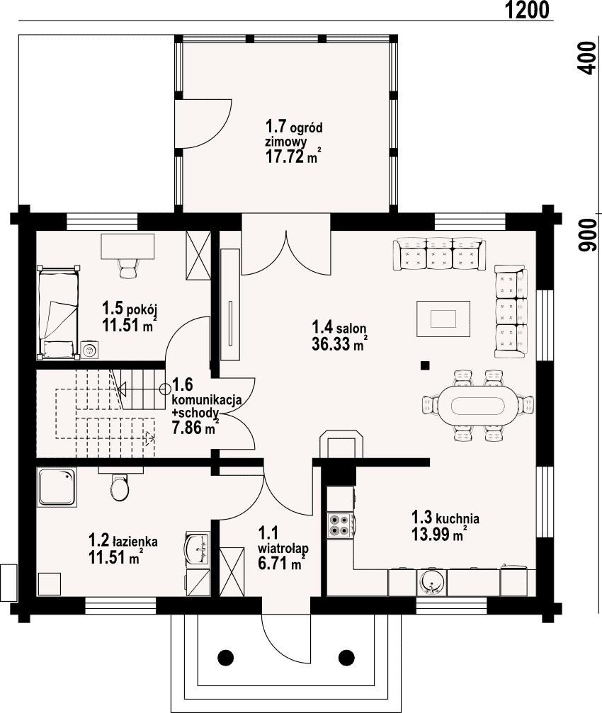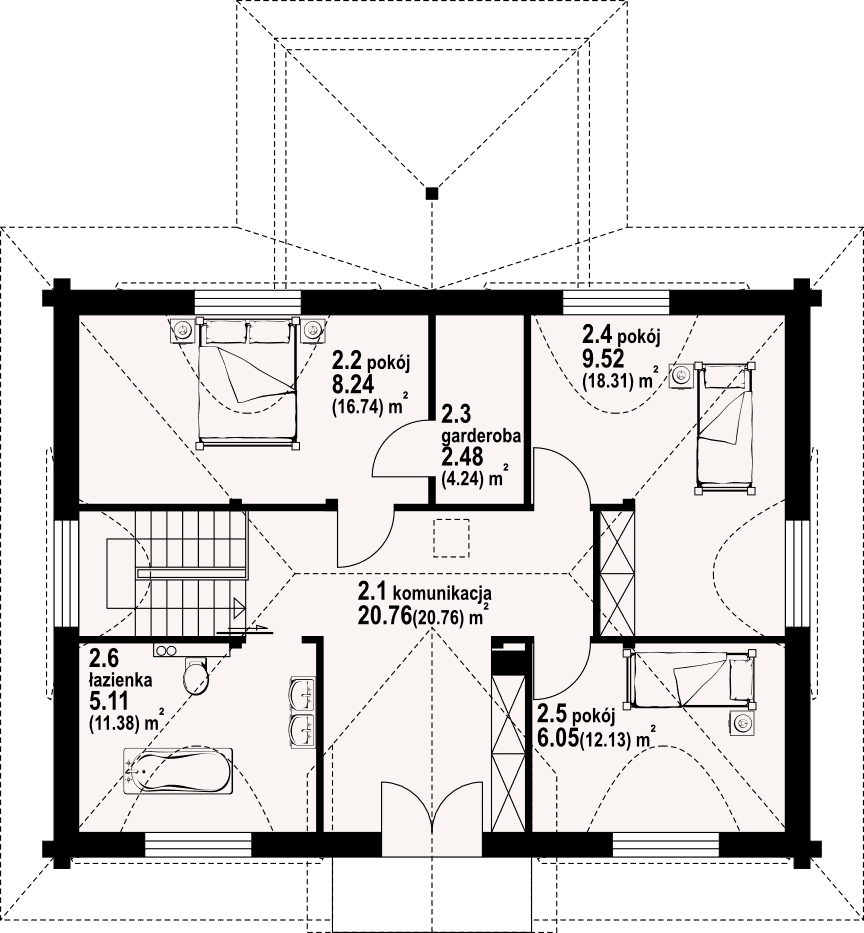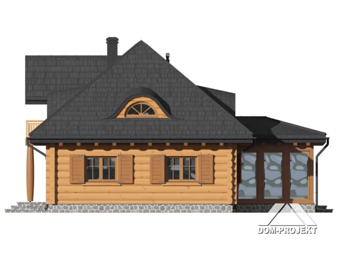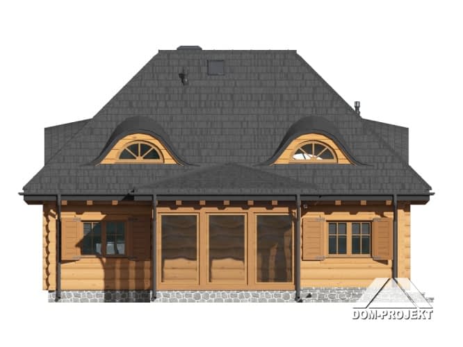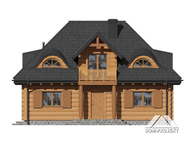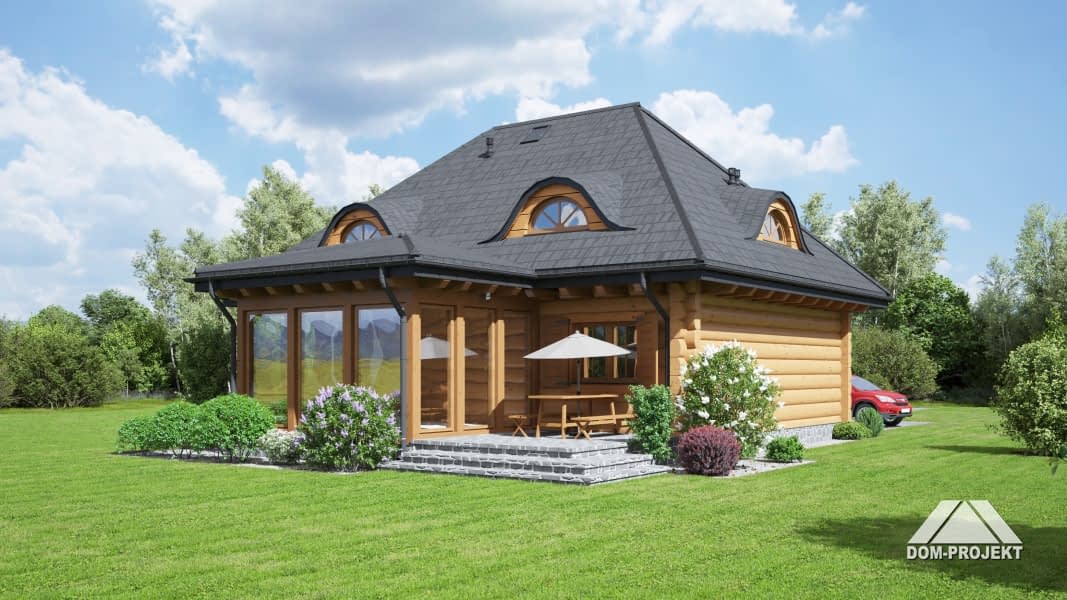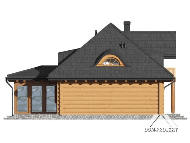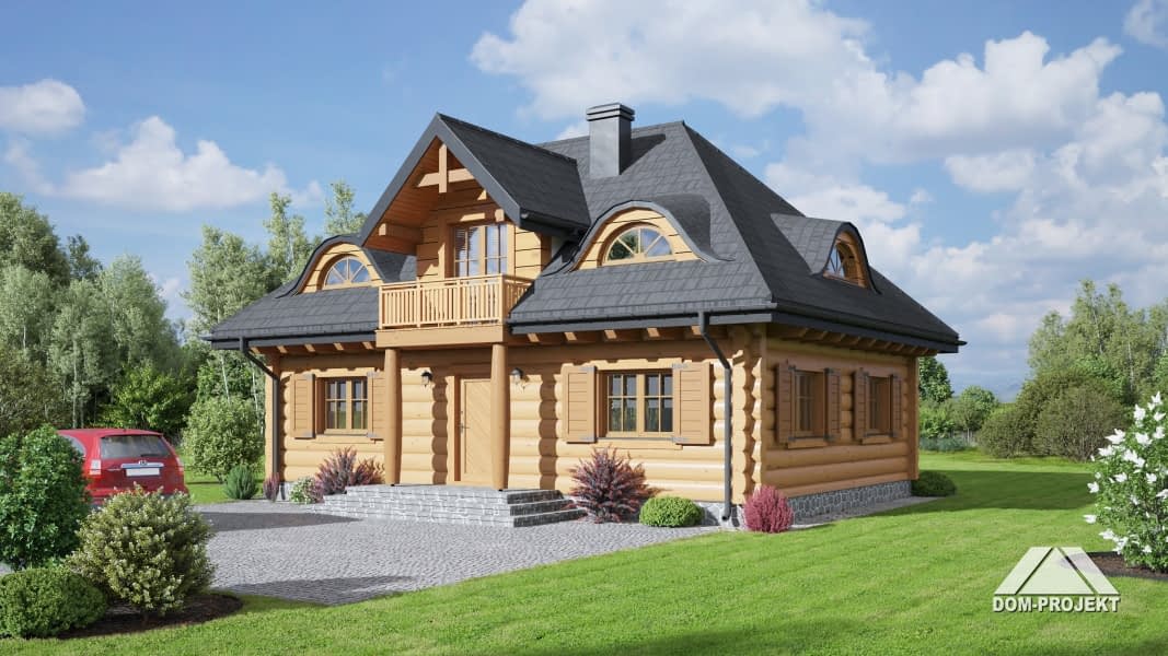 Dom z bali. Na parterze duży salon z kuchnią, kominkiem i wyjściem do ogrodu przez ogród zimowy. Pokój, łazienka, komunikacja i wiatrołap. Na poddaszu trzy pokoje, łazienka, komunikacja, garderoba i balkon.Rzuty